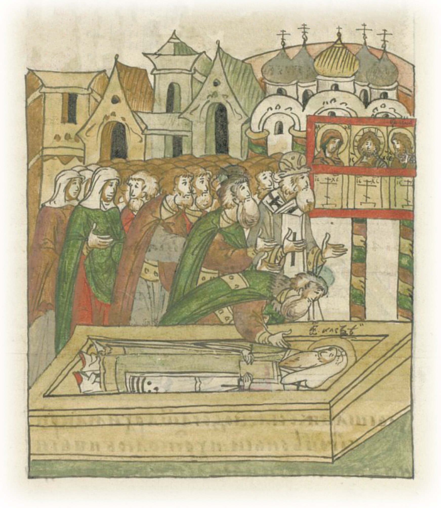Люди же московские многие стеклись (посмотреть) на предивные чудеса святого и великого чудотворца Алексия. Пришел и благоверный и христолюбивый великий князь Василий Иванович и, увидев таковые чудеса, припал (к раке) и поклонился святому и божественному телу святителя и чудотворца Алексия, и возрадовался радостью великою, и, вздохнув из глубины сердца, сказал: «Хвалю и славлю Тебя, Боже мой, и пречистую и всенепорочную Твою матерь, и угодника Твоего и чудотворца Алексия, который благодатью Святого Твоего Духа обновил мощи его чудотворением, и сподобил меня, раба своего, при моей жизни видеть таковые чудеса в области державы моей, и будто дал нам второй источник благодатный в городе нашем Москве, творящий нам дивные чудеса». И радостно праздновали, возблагодарив Бога и пречистую и всенепорочную Его матерь, и угодника его святого чудотворца Алексия.