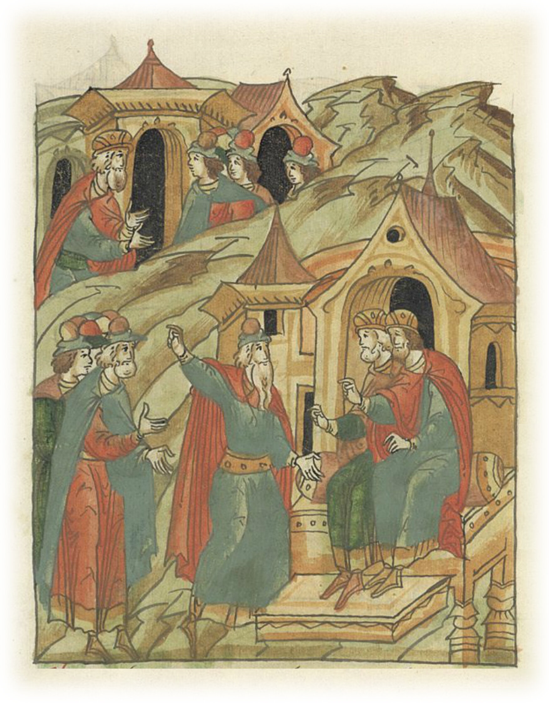 О побоище князя Ярослава Всеволодовича с князем Новгородским Мстиславом Мстиславичем у Липицы. Князь Юрий Всеволодович спрашивает своих бояр, как сходиться на бой с противниками.
