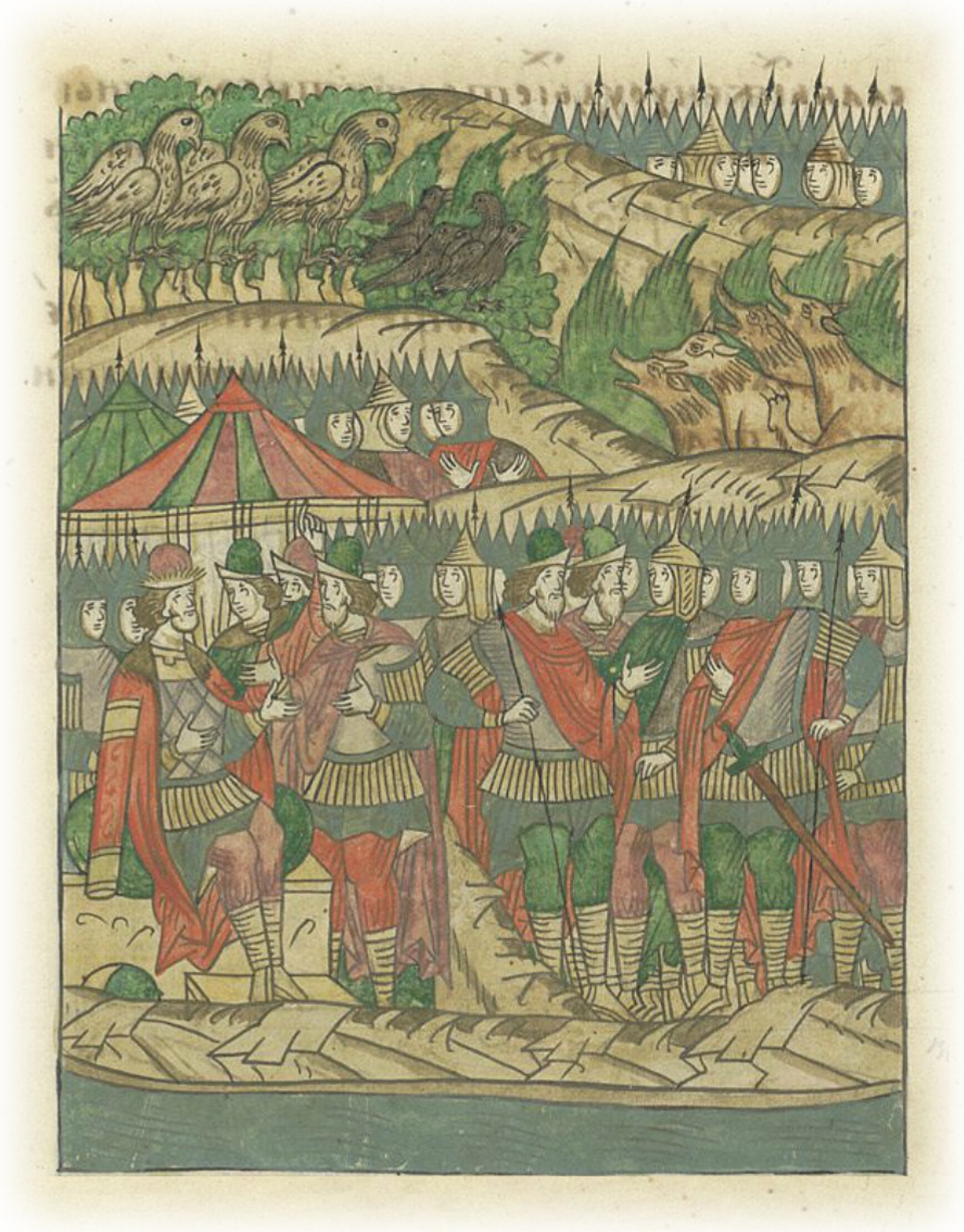 Тогда всеми ночами волки выли страшно, и вороны, и орлы ночью и днем каркали и клекотали, ожидая грозного и Богом изволенного дня кровопролитного, по сказанному: «Где будет труп, там соберутся и орлы». И вот тогда от такого страха богатырские сердца удалых людей начали укрепляться и мужаться, слабых же и худых – страшиться и унывать, видя перед очами смерть. И приспела ночь праздничная Рождества Пречистой Богородицы. Осень же была тогда долгая, и дни солнечные светло сияющие, и теплота великая. Была же и в ту ночь теплота и тихость великая.