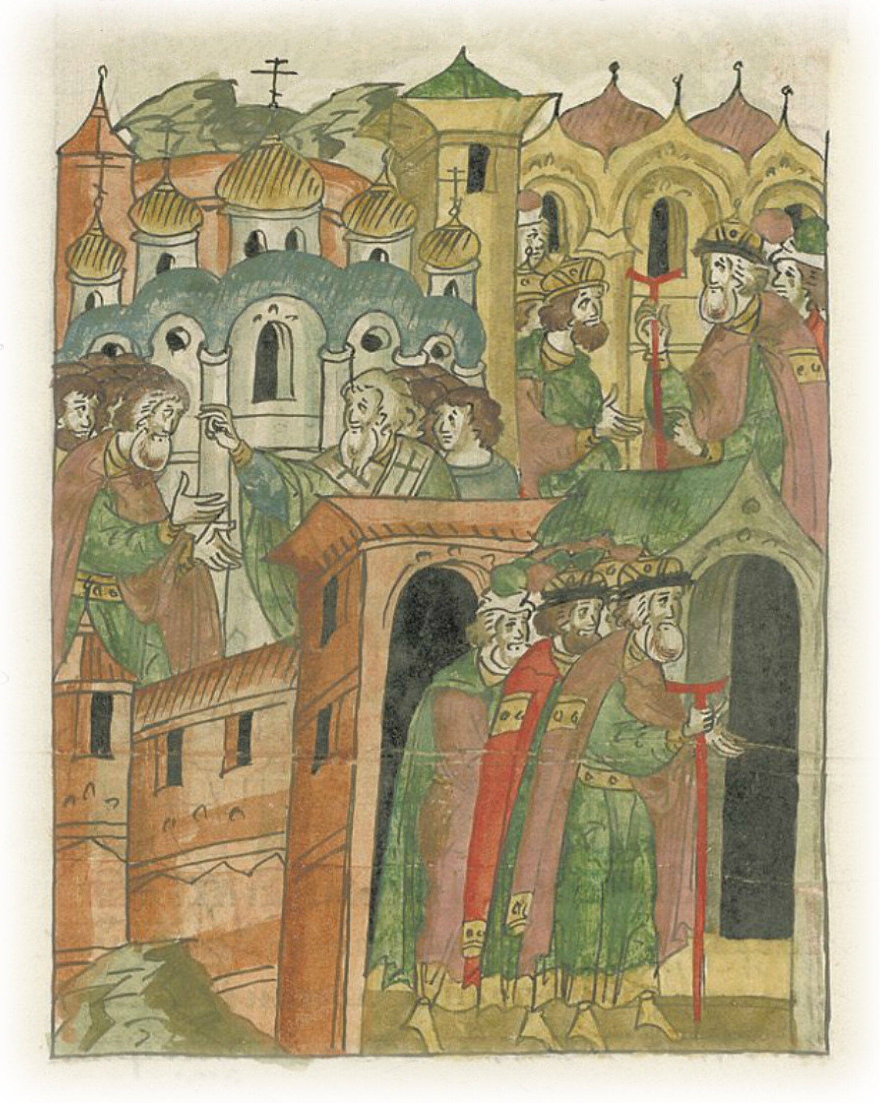 Когда же приспело время божественной литургии, великий государь, отслушав святую службу, пошел со своими братьями и с боярами, и со всеми воеводами на свой двор и сел на своем месте; а братья его, и бояре, и воеводы, и князья смоленские, и бояре по чину здравствовали его; а князь великий им слово свое сказал о здравии да велел им сесть.