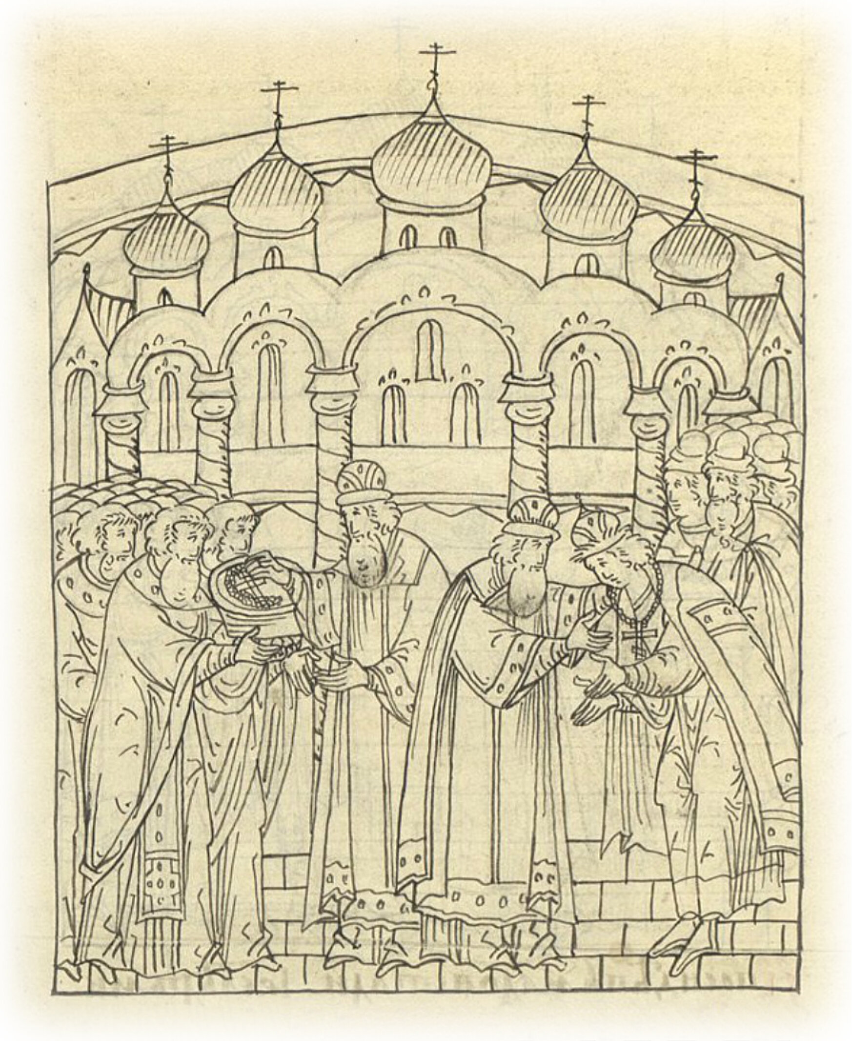 И митрополит взял животворящий крест с золотого блюда и возложил его на великого князя Ивана Васильевича и прочел молитву во услышание всем: «Господи Боже наш, Царь царствующим и Господь господствующим, пророком Самуилом избрав раба Своего Давида и помазав его в цари над своими людьми Израиля, Ты и ныне услышь нашу молитву недостойных, и от святого жилища Твоего благоверного раба Своего великого князя Ивана Васильевича, которого благоволил воздвигнуть в цари в народе твоем, который стяжал Честною Кровью Единородного Тебе Сына, сподоби помазать его елеем радости, огради его силою Животворящего Твоего креста, положи на голове его венец из честного камня, даруй ему, Господи, долготу дней, дай же в руки его скипетр царствия, посади его на престоле правды, огради его всеоружием Святого Духа, утверди его мышцу, покори ему все варварские народы, всели в его сердце страх Божий и милостивое око к послушным, соблюди его в непорочной вере, покажи его надежным хранителем святой Твоей соборной церкви, пусть судит людей Твоих правдою и нищих Твоих судом, спасет сынов убогих и наследник будет Небесного Твоего Царствия». Возглас. «Яко Твоя держава и Твое царство и сила и слава Отца и Сына и Святого Духа и ныне и присно и во веки веков. Аминь». И помолились.