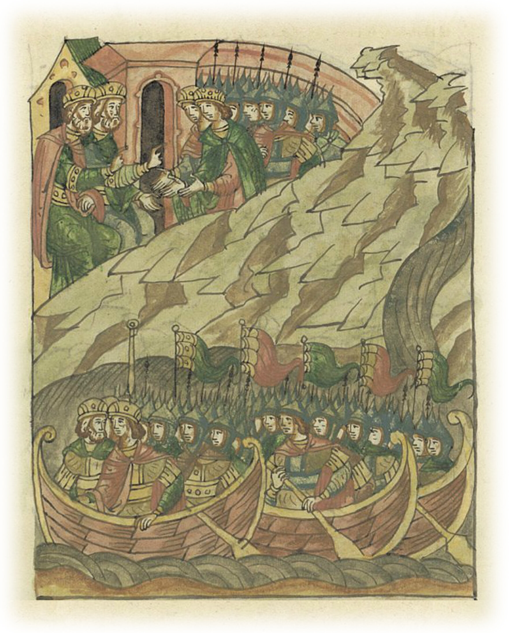 И послал Давид сына своего Святослава, а Юрий – Олега, с дружинами своими в помощь. И встретились все на Волге, на устье Оки, в насадах и в ладьях.