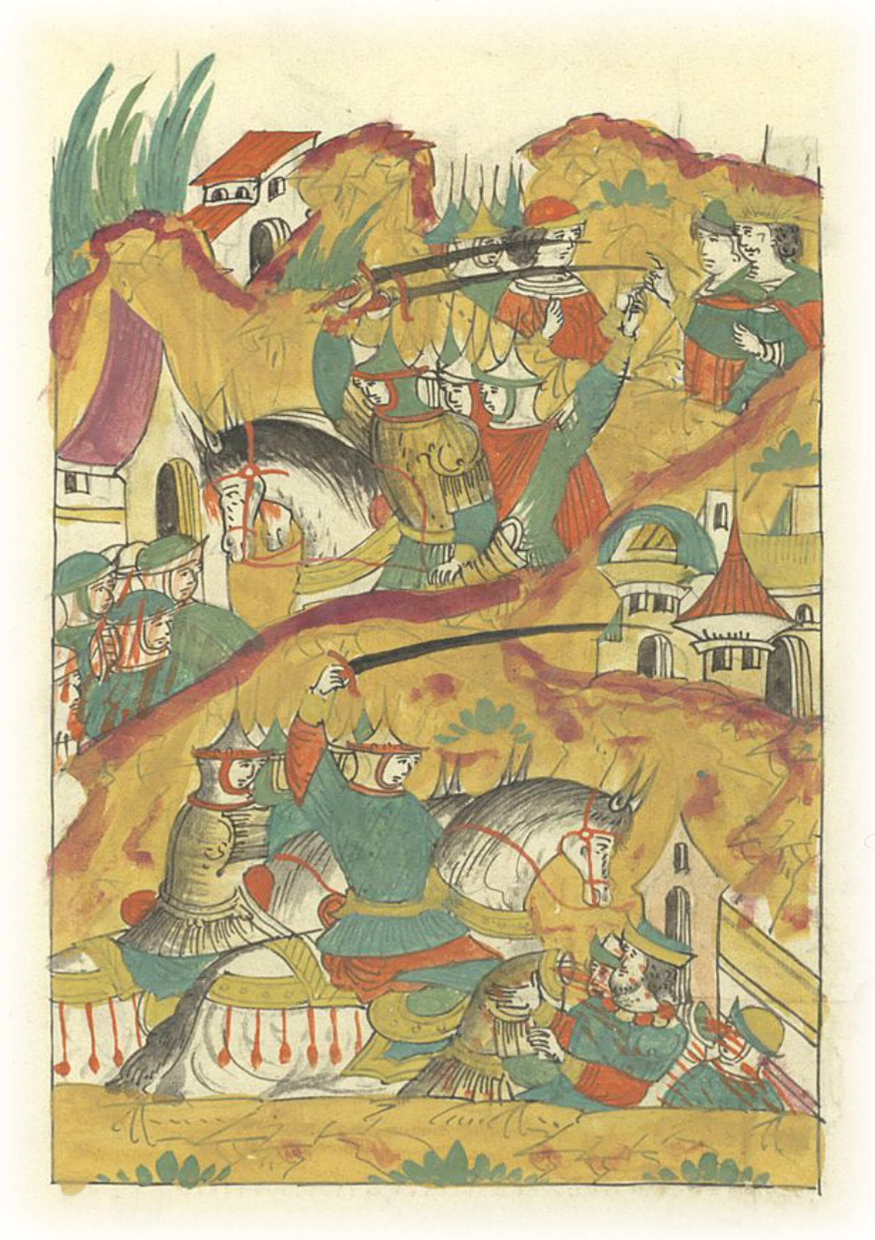 Языки говорят воеводам царя Ивана Васильевича, что магистр окопался большим рвом вокруг города Рындола, бьет из пушек и пищалей и приступает к Рындолу.
