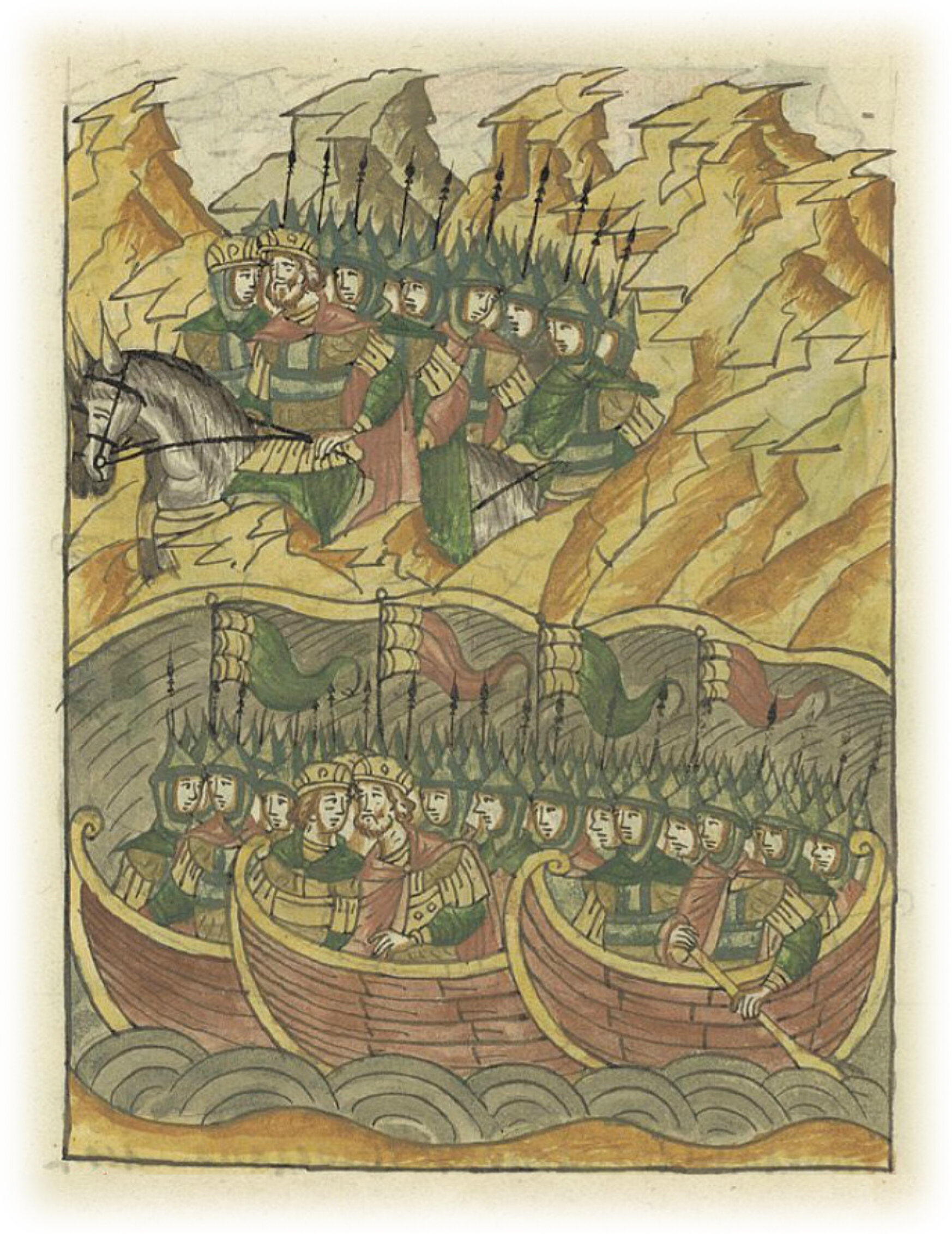 О войне против болгар. Союзные войска встречаются на Волге в устье Оки, оттуда идут вниз и выходят на берег на Исадах против Ошлы.