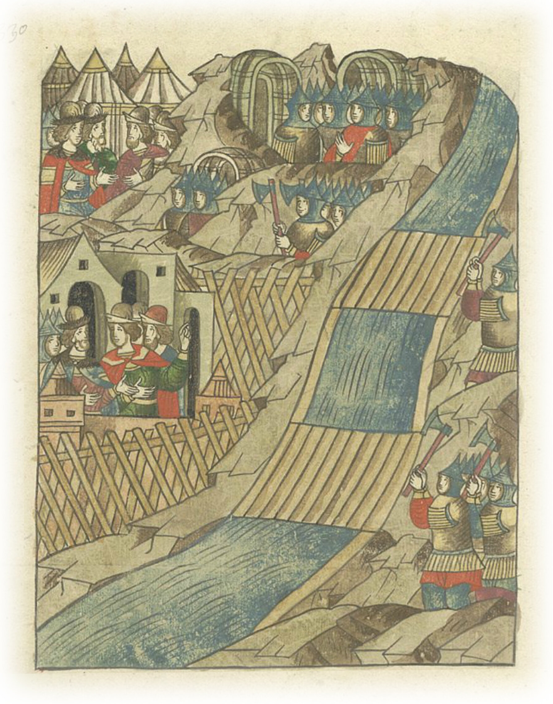 Войско великого князя Дмитрия Ивановича и всех русских князей огораживает Тверь частоколом и строит два больших моста через Волгу.