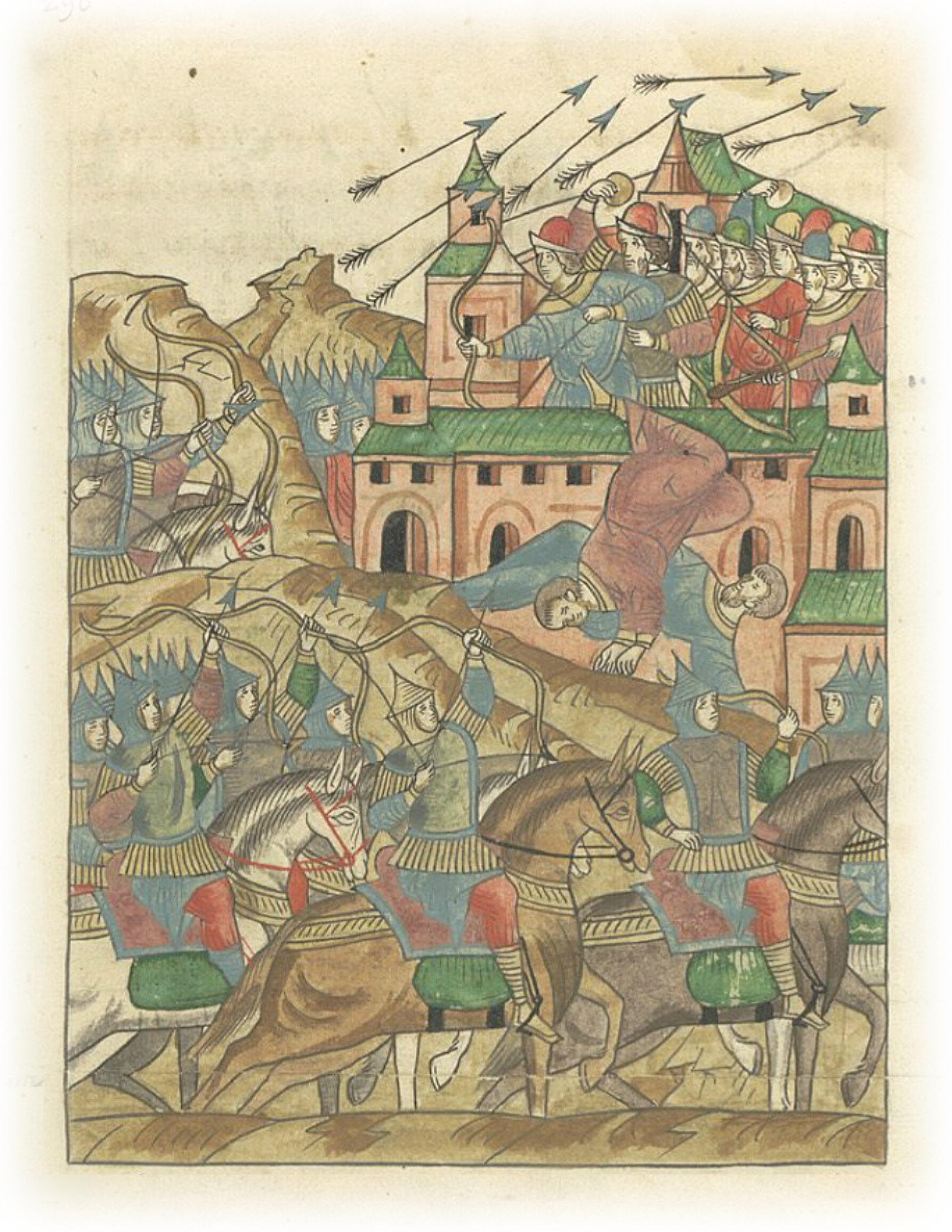 Горожане же еще больше стрел пускали на них, и камни метали, и из самострелов, и тюфяков* (стреляли). Татары же разъярились и начали стрелять на город со всех сторон. И летели стрелы их на город, словно дождь сильный и умножающийся очень, не дающий смотреть, потому что и воздух омрачился от стрел; и многие горожане в городе и на забралах падали мертвыми, ибо одолевали татарские стрелы больше, нежели городские. Был же приступ их к городу яростен очень; ибо были у них стрелки весьма умелые, и одни из них стоя стреляли, а другие быстро рыская туда и сюда, ибо так научены были, и стреляли без промаха. * род огнестрельного оружия, от греч.слова – туфекион.