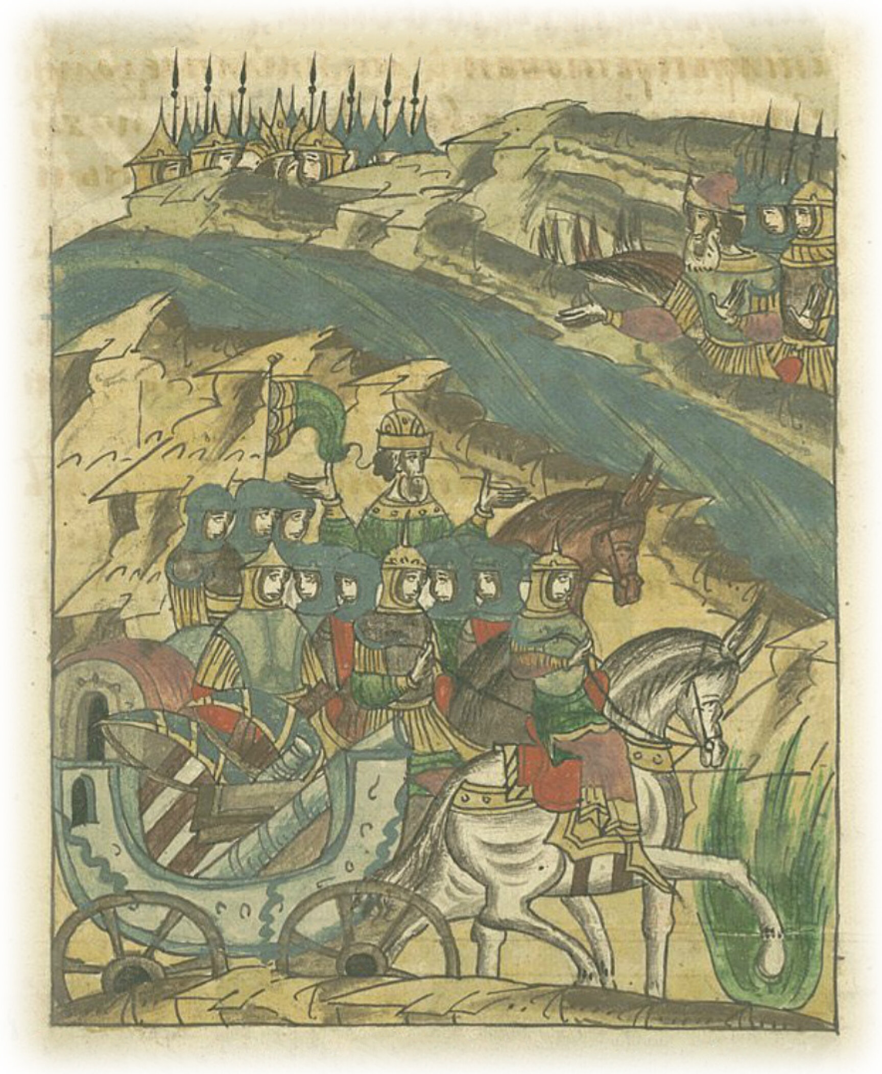 Воеводы царя Ивана Васильевича, разделившись, идут в погоню за царем Емгурчеем.