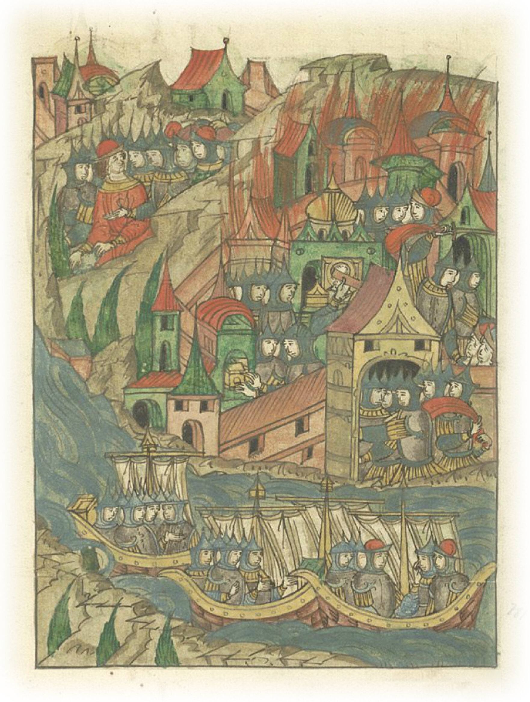 А из Заволочья собралось много новгородцев и поплыли в насадах и ушкуях, взяли город Устюг и огнем пожгли, церковь соборную разграбили и захватили казну и много золота, и (оклады с) икон ободрали.