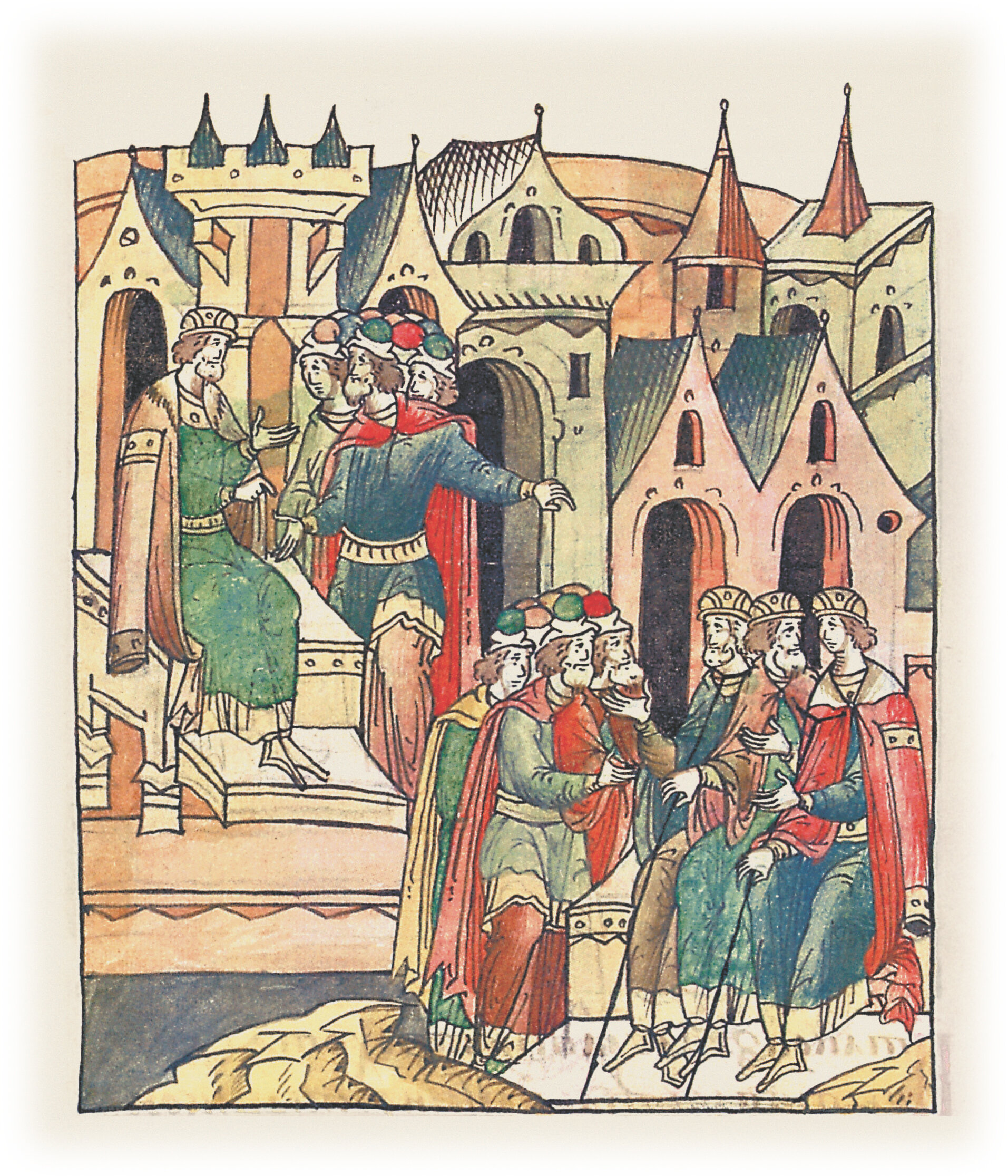 Ругодивские посадники Яким и Захар приезжают в Москву. Воеводы царя Ивана Васильевича Алексей Адашев и Иван Михайлов сообщают им, что государь пожалует их, если сдадут его воеводам помимо Ругодива Вышгород.