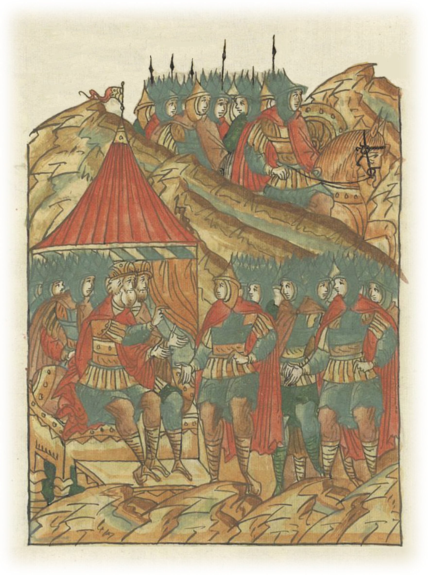 И, созвав воинство, он начал говорить: «Братья! Встанем со всем усердием против этих супостатов. Добыча сама пришла к вам в руки. Только сражайтесь неустанно, и будут вам кони, доспехи и порты*. * одежды.