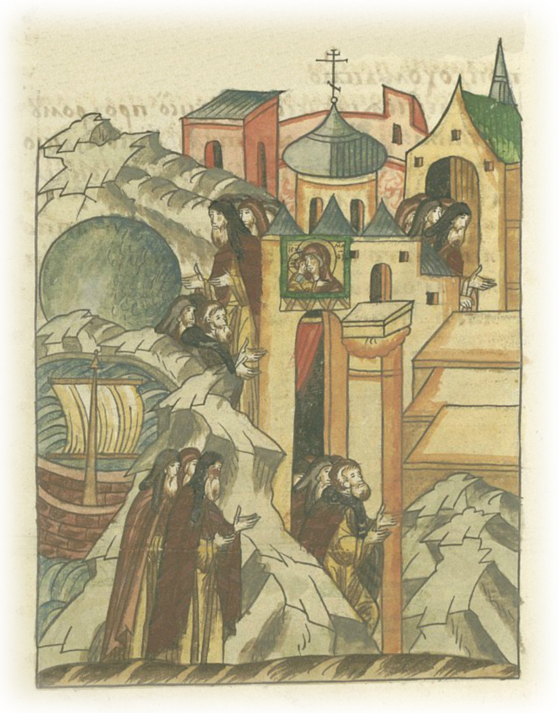 О походе митрополита Пимена в Царьград со Смоленским владыкой Михаилом и Спасским архимандритом Сергием. Чернецы митрополита Пимена и епископов кланяются святыням Царьграда.