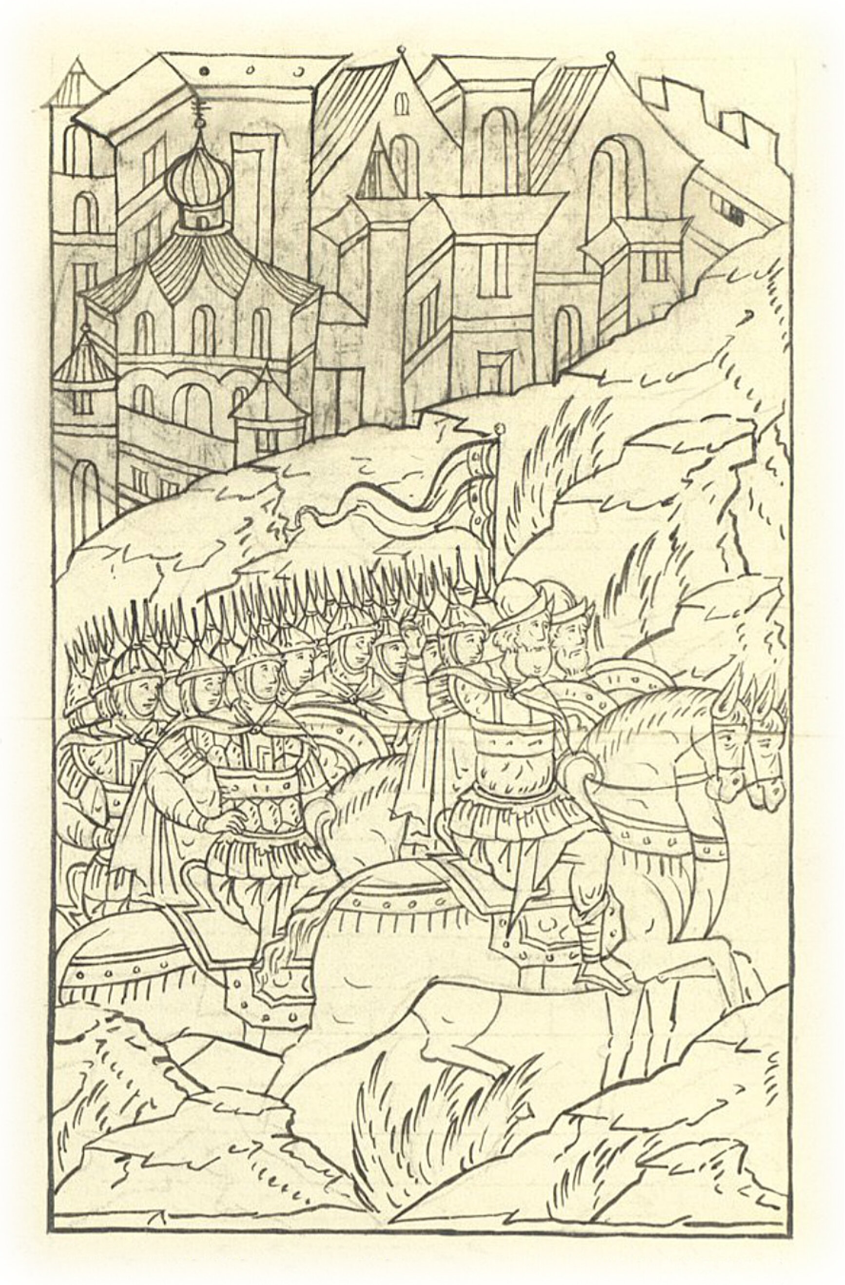 Воеводы царя Ивана Васильевича, разделившись, идут в погоню за царем Емгурчеем.