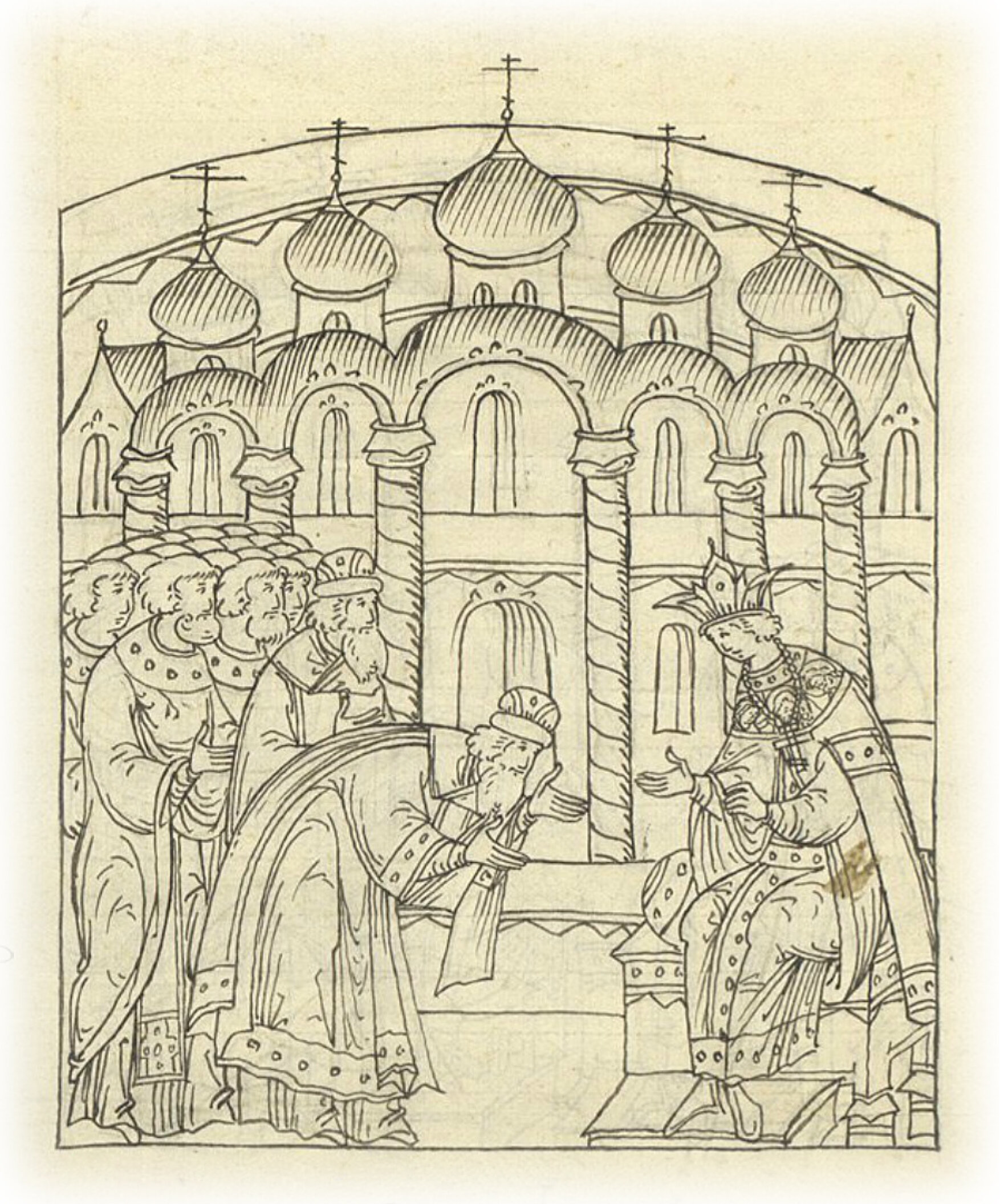 И после многолетий митрополит приветствовал великого царя: «Божьею милостью радуйся и здравствуй, православный царь Иван, всея Руси самодержец, на многие лета»; и поклонился царю митрополит.