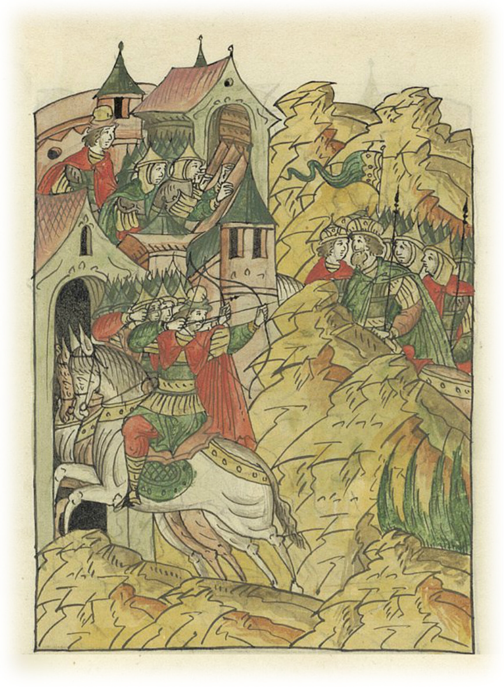 О войне против болгар. Болгары, пустив по стреле в войско князя Святослава Всеволодовича, в смятении бегут к городу и затворяются там.