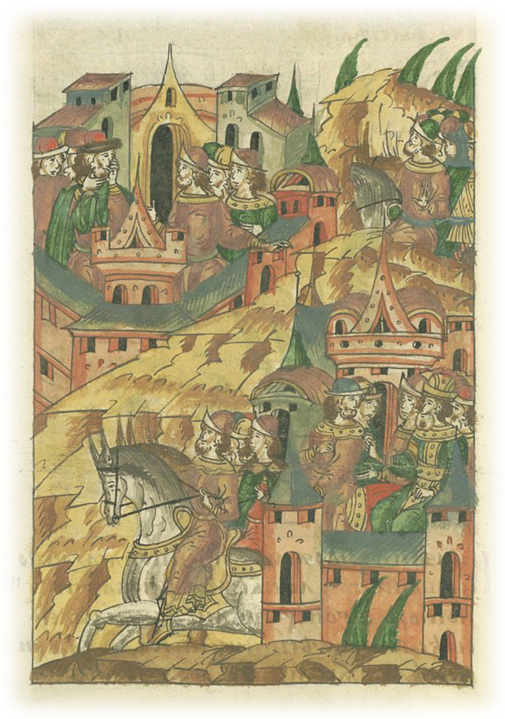 И послал на поиски князя Юрия Святославича Смоленского, желая убить его самого и его детей. И услышал князь Юрий Святославич Смоленский, что его город и все его великое княжение захвачены, а его великая княгиня уведена в плен в Литву, что князья и бояре, преданные ему, уведены в плен в Литву, одни изгнаны, а другие казнены, с великой скорбью и горестью в душе