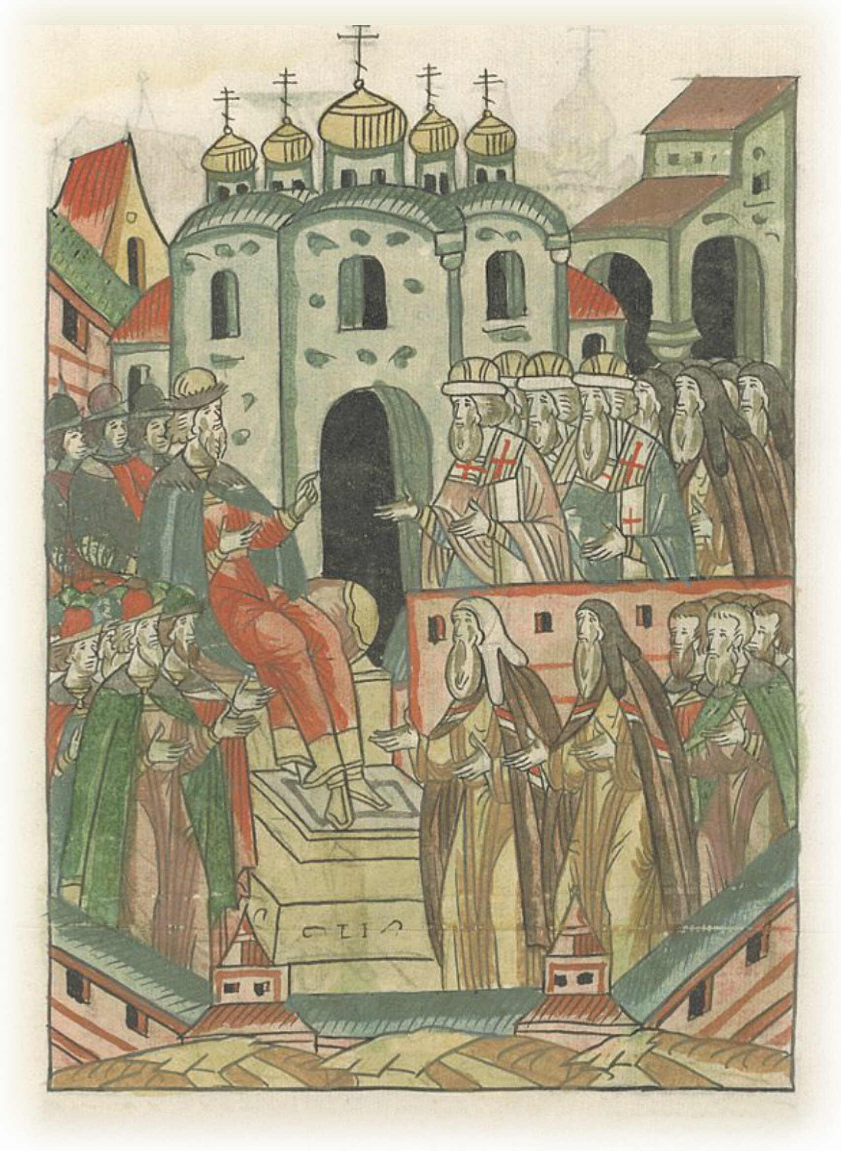 и повелел созвать собор всех епископов и архимандритов на Москве, и дал суд архиепископу на митрополита. И было большое расследование.