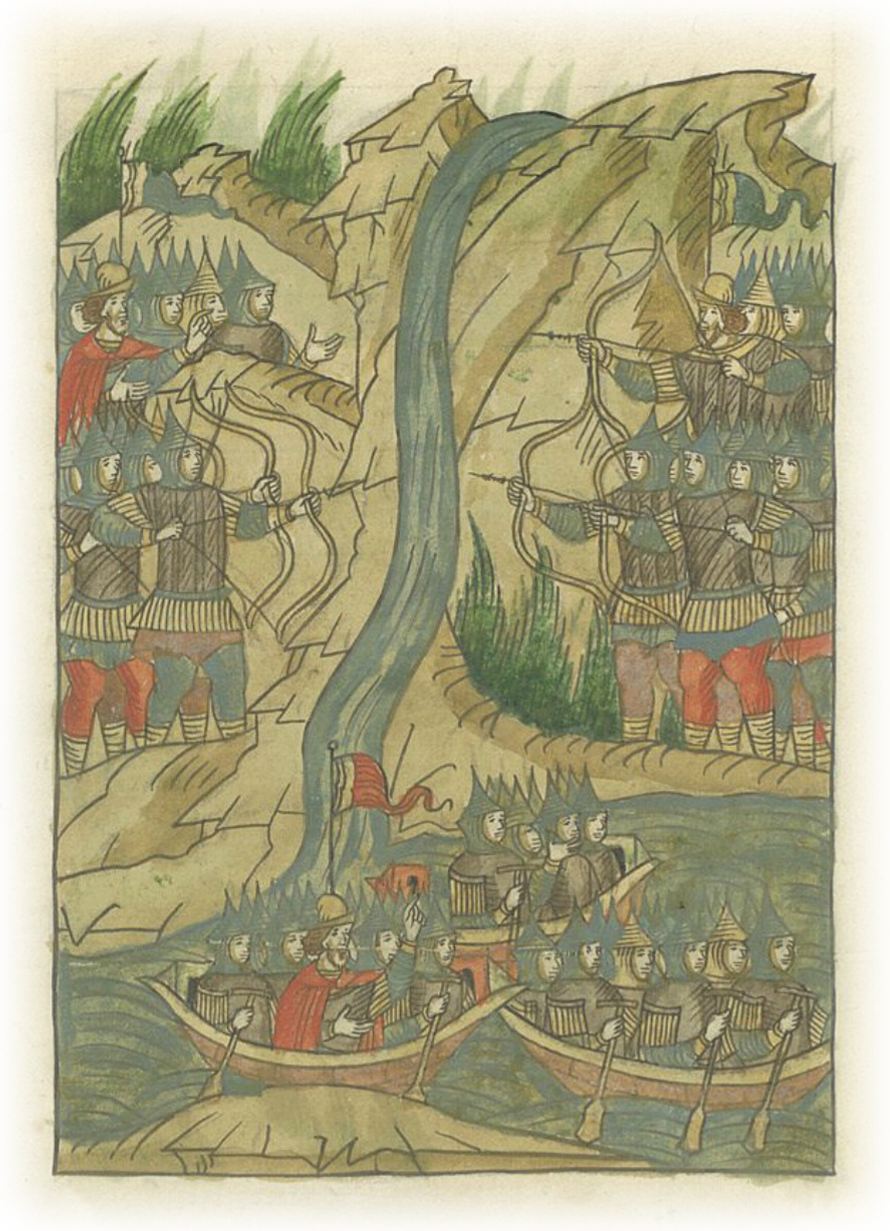 Руно же повелел своим за ними тоже выйти на берег; а татары забежали за речку и начали за ней биться.