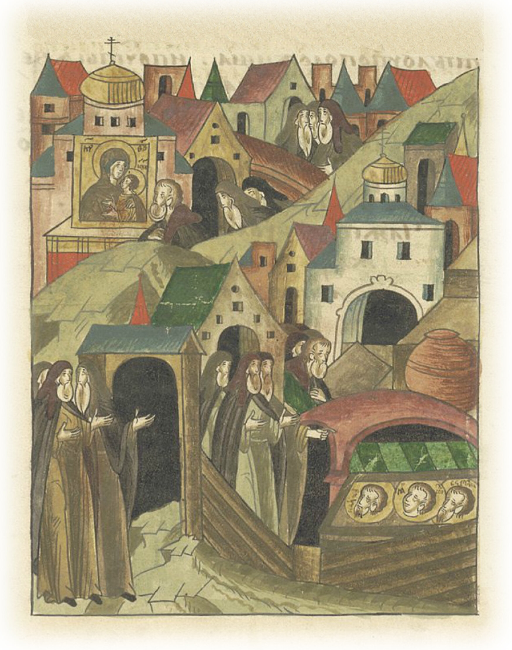 Также в шестой день пошли к Пречистой Богородице Одигитрии, что на русском языке зовется Наставницей, и, поклонившись, целовали со страхом и трепетом. И взяли поморизмо*, и помазались радостомою** так называемою. И пошли в великий честный монастырь Пантократора, и целовали святую доску Господню, на которой, с креста сняв, тело Христово положили, и Пречистой слезы на той доске запечатлелись. И там есть корчага***, из самородного камня сделана, в которой Христос воду в вино претворил, и держат в ней ныне и всегда воду святую Богоявленскую. Также видели там лежащие головы святых мучеников Сергия и Вакха, и Иакова Перского. * поморизмо – от греч. мирисмос – помазаться святым миром; ** радостома – розовая вода (греч.); *** сосуд.
