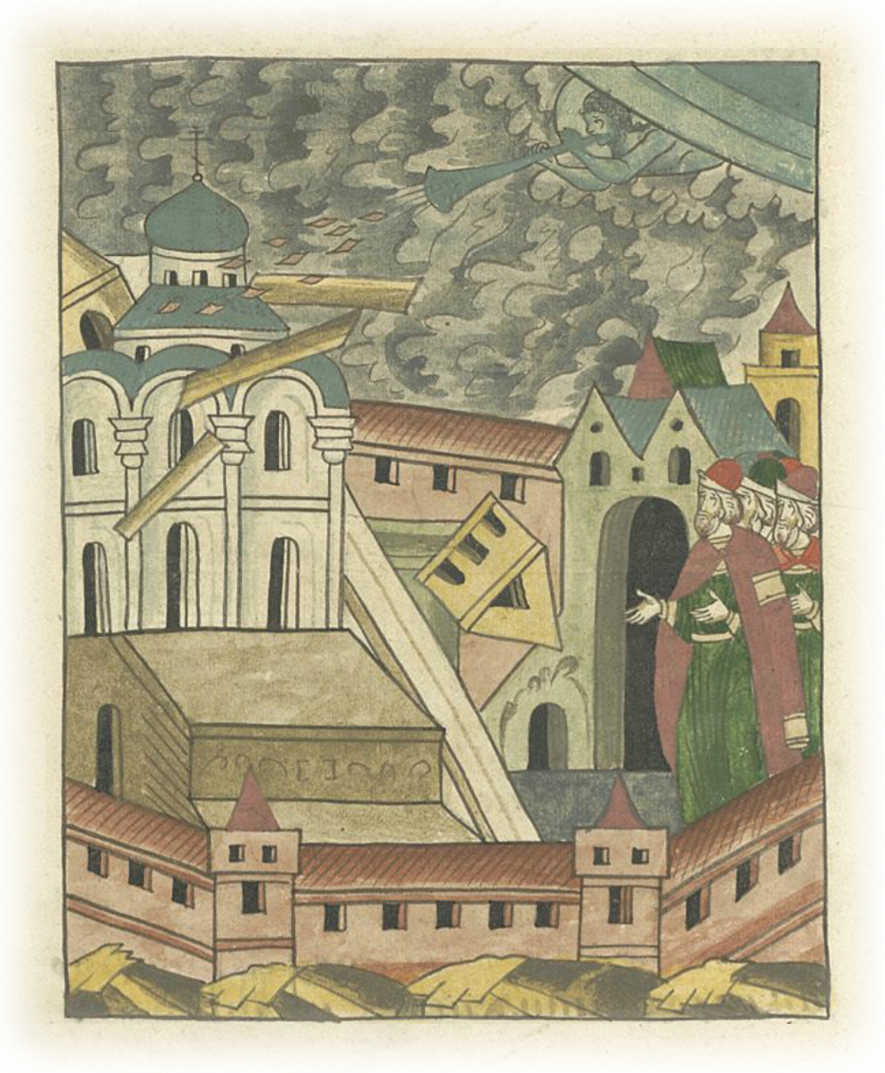В том же году была сильная гроза, и гром ударил в Твери в соборную церковь, и много было знамений со страшными молниями и вихрями.