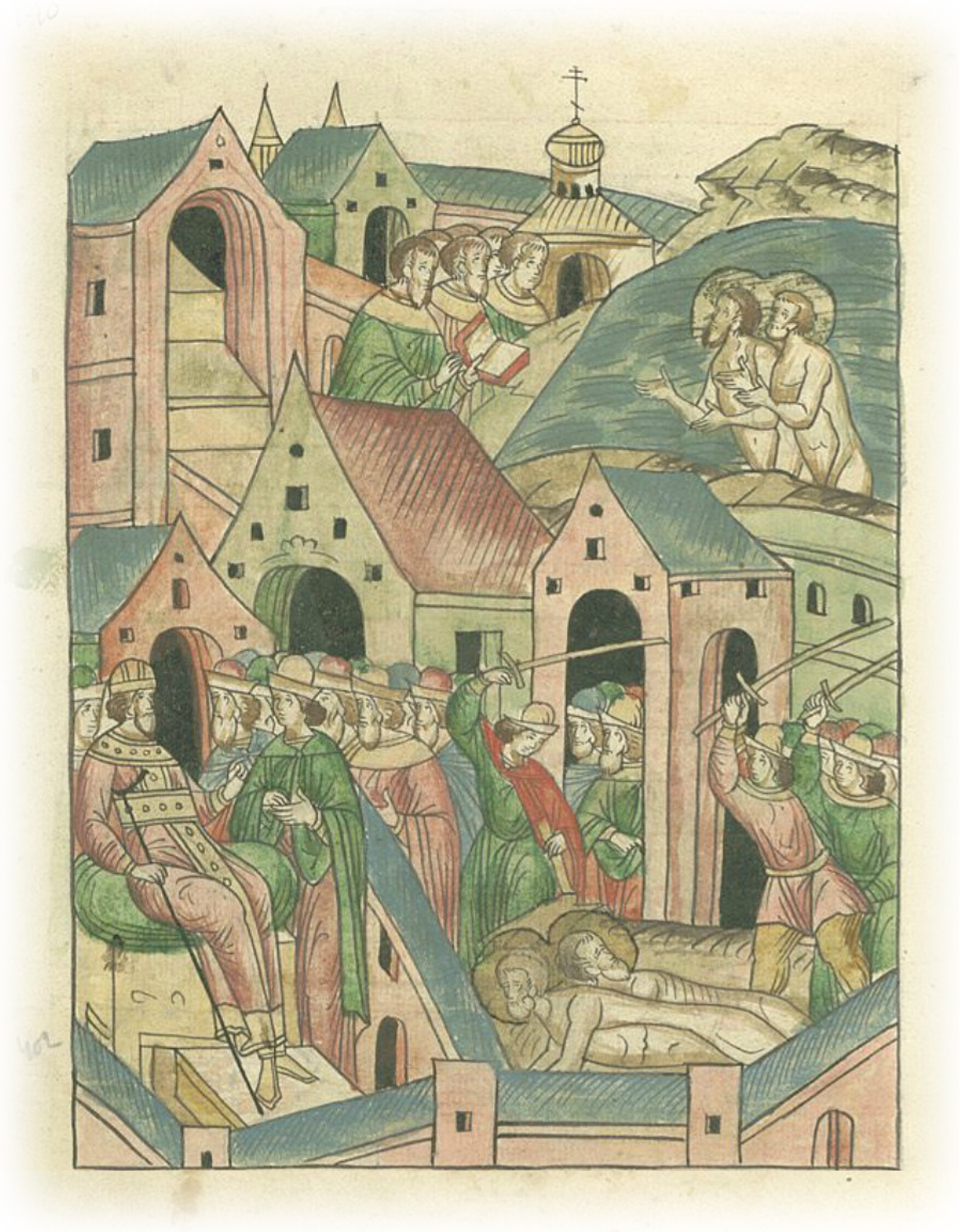 А два литвина его бóльшие крестились в христианскую (православную) веру; он же хотел их крестить в свою веру, и не послушались его; король же Ягайло казнил их со многими муками и смерти повелел их предать.