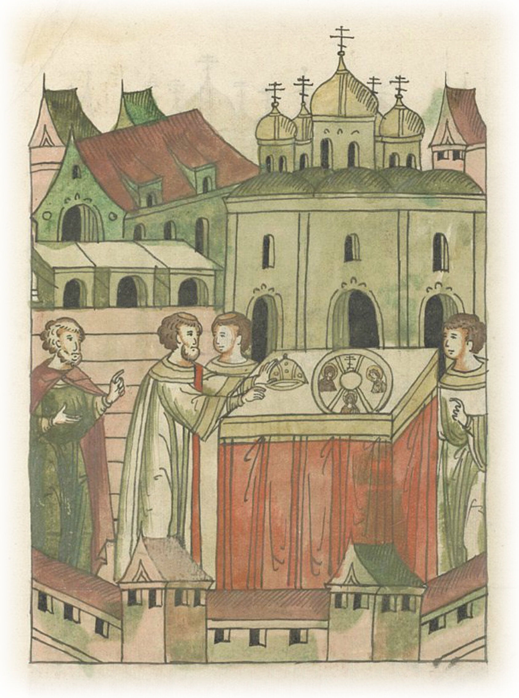 и повелели посреди церкви поставить аналой, а на нем положили шапку Мономаха и бармы.