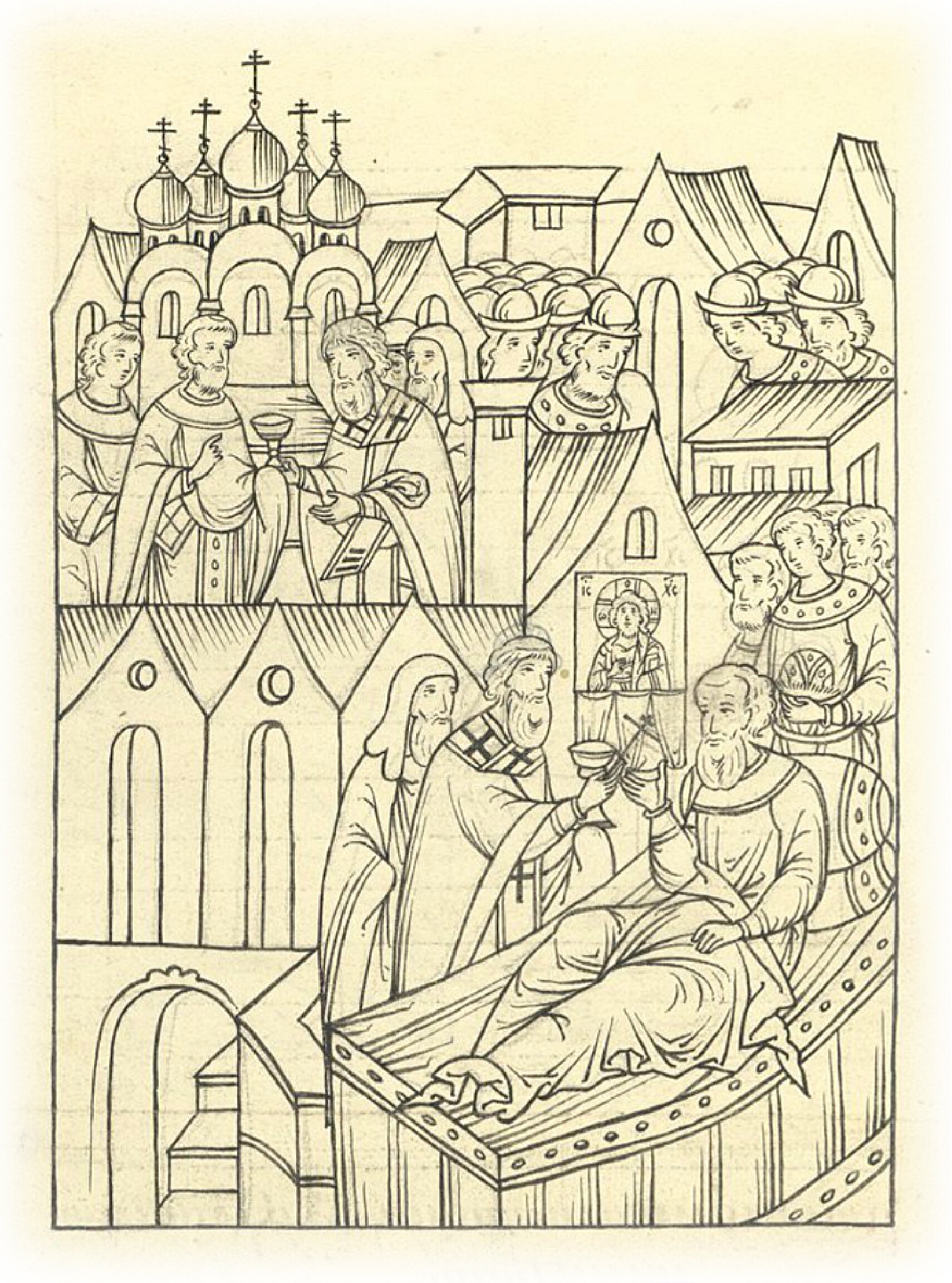 И повелел князь великий тайно служить в Благовещенском соборе в приделе Василия Великого благовещенскому попу Григорию; а на обедне там были владыка Коломенский Вассиан да старец Мисаил Сукин, да протопоп Алексей; а несли к великому князю дары владыка Коломенский Вассиан да Мисаил Сукин.