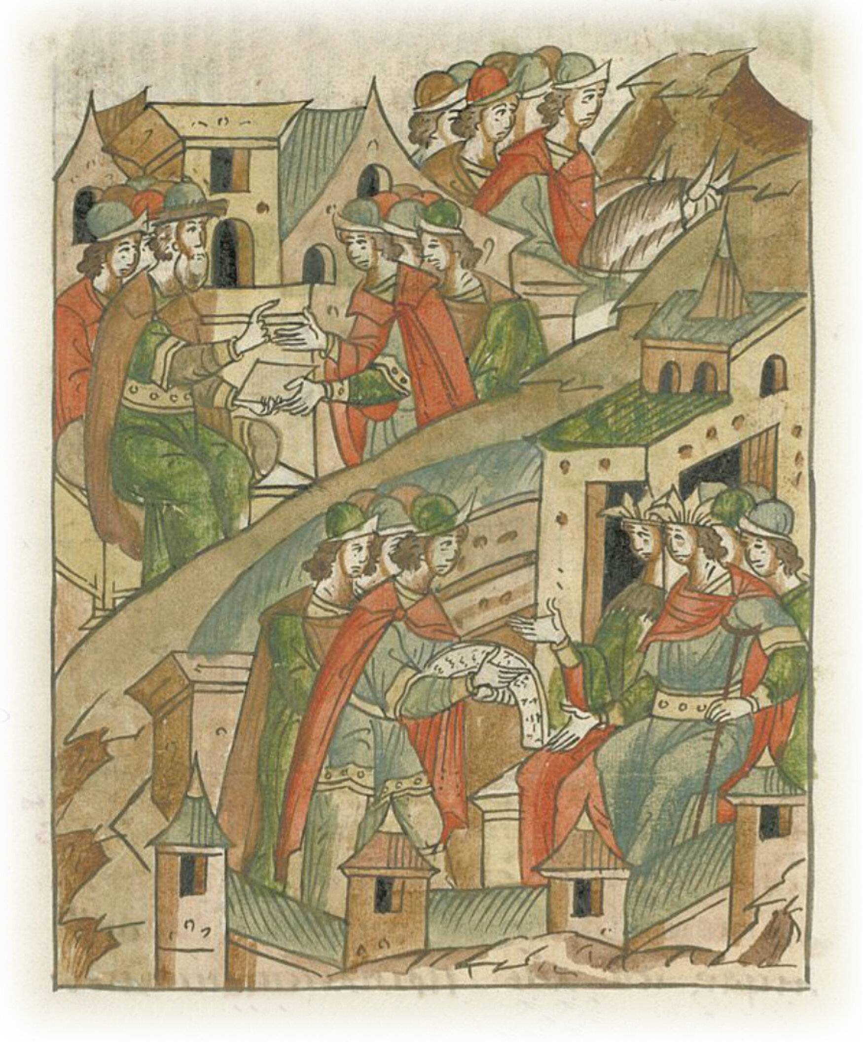 Ругодивские посадники Яким и Захар приезжают в Москву. Воеводы царя Ивана Васильевича Алексей Адашев и Иван Михайлов сообщают им, что государь пожалует их, если сдадут его воеводам помимо Ругодива Вышгород.