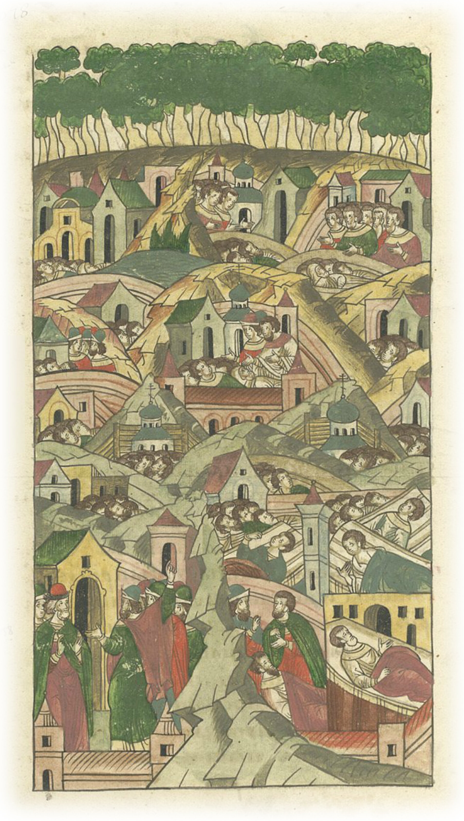 В том же году в Переяславле был мор. Болезнь была такова: прежде всего как рогатиной ударит за лопаткой или под грудью, напротив сердца или между плеч. И, так разболевшись, человек начинал кровью кашлять, в теле разгорался огонь, а потом начинались пот с ознобом. И, пролежав один или два дня, а редко бывало, чтобы кто-то пролежал три дня, человек умирал. А если болели чумой, то у каждого болезнь проходила по-разному: у одного чумной бубон был на шее, у другого – на бедре или за пазухой, или под скулою, или же за лопаткою. И умирало на дню иногда по семьдесят человек, а иногда по сто или по сто пятьдесят. Не только в Переяславле было так, но и по всем волостям, и селам, и монастырям Переяславским. А перед этим мор был в Нижнем Новгороде и пришел снизу от Бездежа в Нижний Новгород, а оттуда в Рязань и Коломну, а оттуда в Переяславль, а оттуда в Москву. И так мор разошелся по всем городам, и в Тверь, и во Владимир, и в Суздаль, и в Дмитров, и в Можайск, и на Волок, и по всем городам распространился сильный и страшный мор. Увы, увы! Кто будет в силах поведать страшную и горестную повесть? А на Белоозере тогда не осталось ни одного живого человека. И была великая скорбь по всей земле, и опустела вся земля, поросла лесом, повсюду стали непроходимые заросли, и хоронили в одной могиле по десять и по двадцать человек.