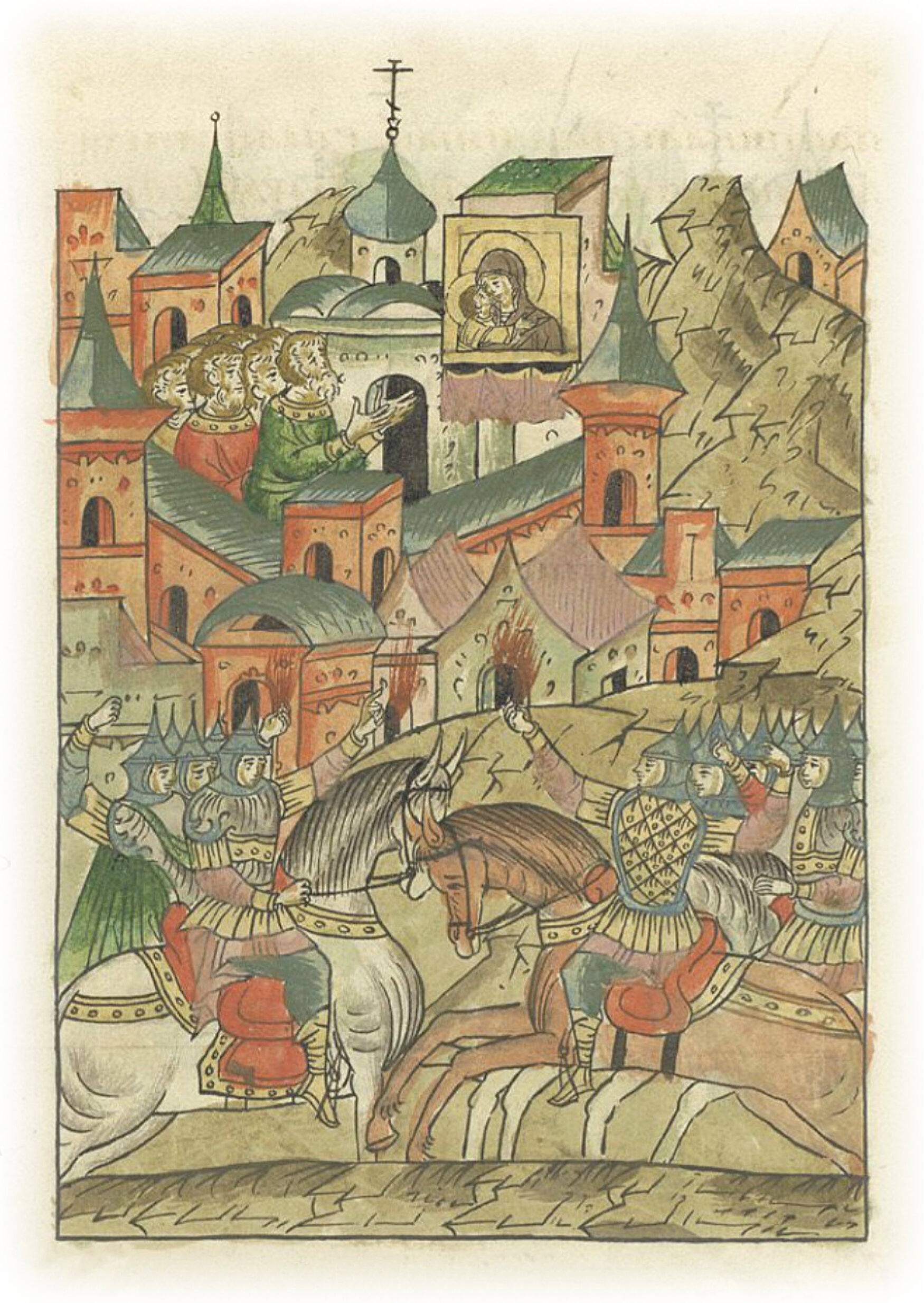 И все посады зажгли в один час, а сами в то время со всех сторон начали к городу приступать. А тогда засуха была великая, и со всех сторон огонь объял город, и храмы загорелись, а от дыма ничего нельзя было увидеть; и они приступали внезапно к городу, ко всем воротам и туда, где не было укреплений каменных. И в великой печали и скорби город был и в недоумении многом. Не имея ниоткуда помощи, но только со слезами молились Господу Богу и пречистой матери Его, крепкой помощнице и молебнице к Сыну своему и Богу нашему; к тому же приспел тогда праздник ее, а также и великих чудотворцев.