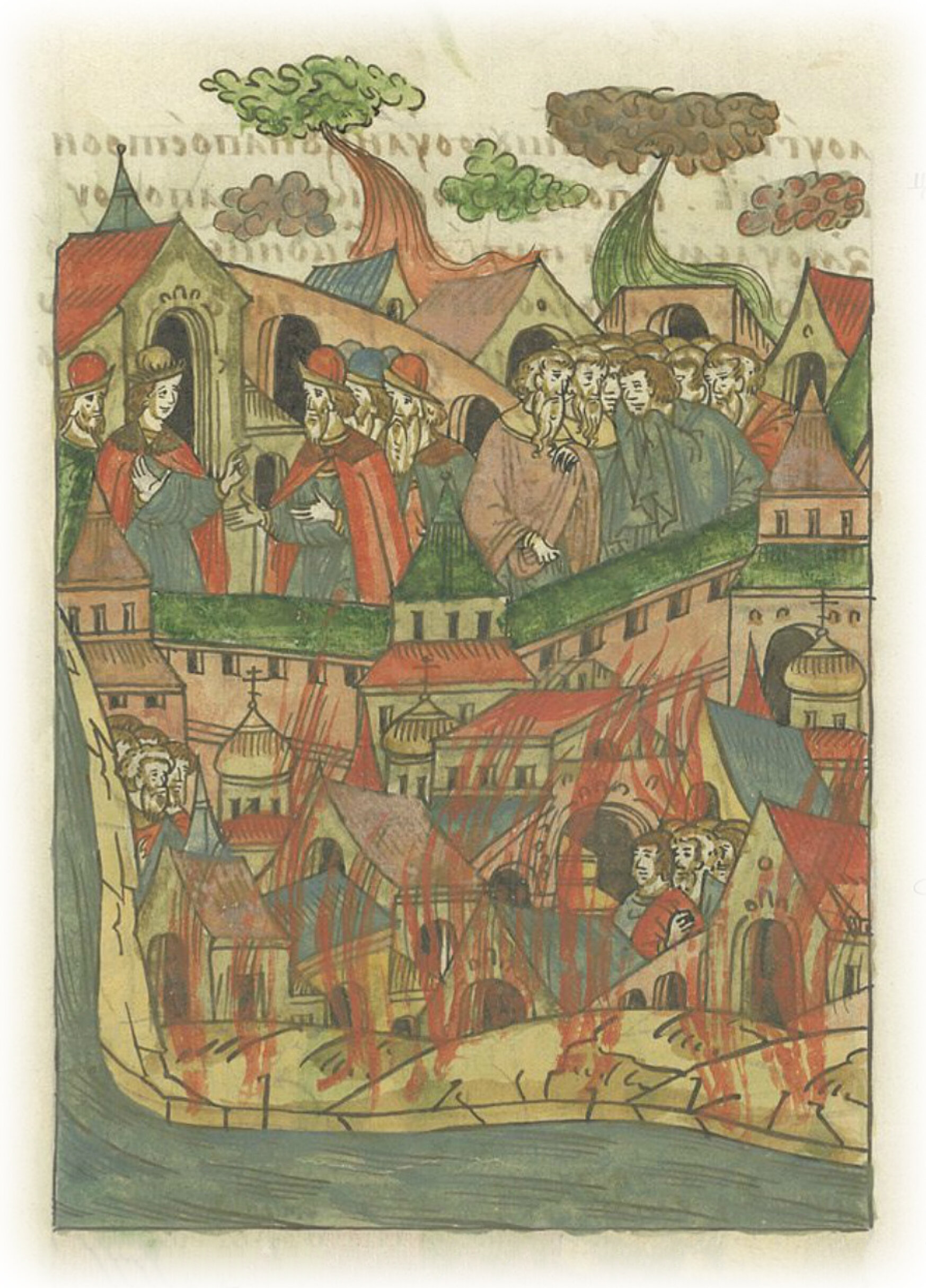 В том же году месяца мая в 23 день, в два часа ночи загорелся посад на Москве у церкви Николы Мокрого, и много дворов сгорело. Горело вверх по рву за Богоявленскою улицей мимо Весяковых дворов, от церкви Богоявления улицею до церкви Ивана Святого на пять улиц, а от Ивана Святого на подол по Васильевский луг, да на Большую улицу, на Острый конец, и по самую реку, да до церкви Козьмы и Дамиана на Остром конце. Тяжело тогда было в городе, ибо ветер был сильный и вихри; но Бог сохранил город.