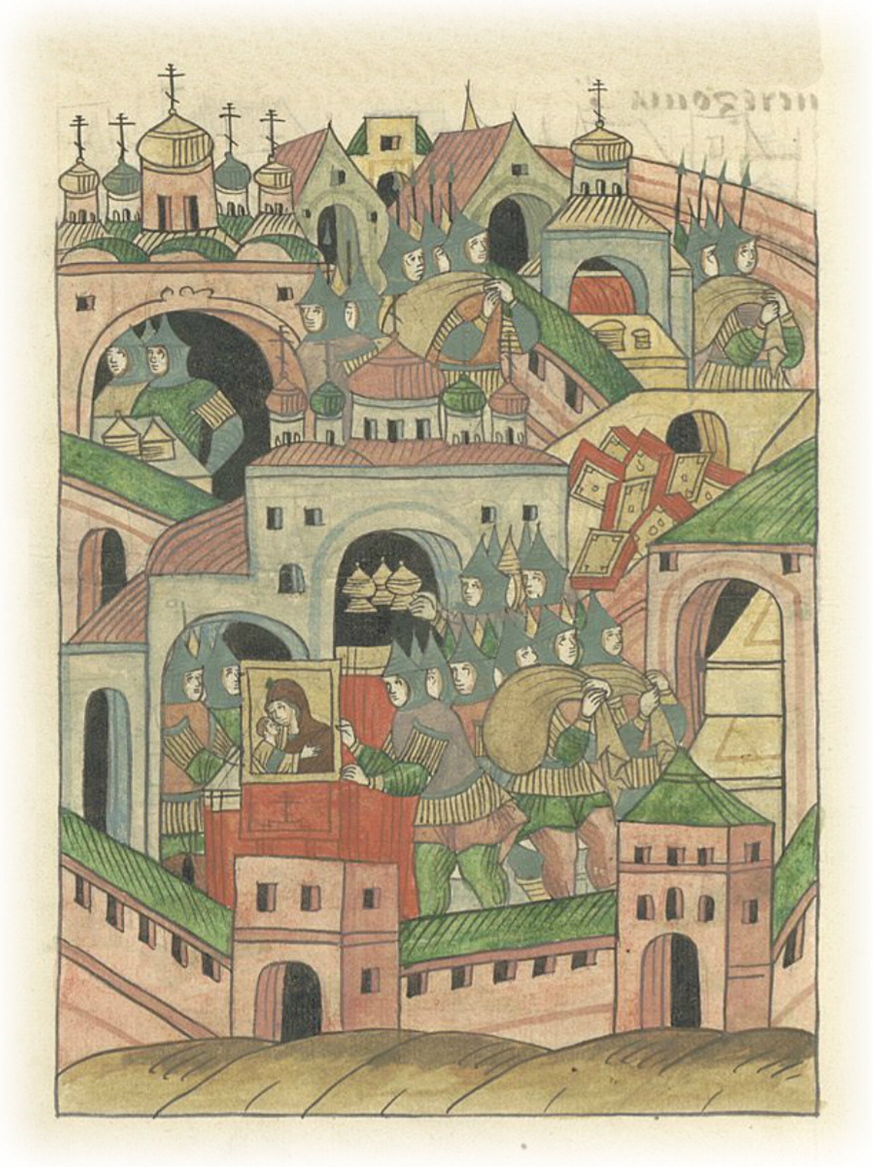 А церкви соборные разграбили, и алтарей святые места осквернили, и кресты честные, и иконы чудные ободрали, украшенные золотом и серебром, и жемчугом, и каменьем дорогим; и пелены, золотом шитые и жемчугом саженые, ободрали, и со святых икон оклады ободрали, и святые иконы попрали, и сосуды святые церковные служебные расхитили. И книг (было) множество снесено со всего города и с сел. И всё, что в соборных церквах многое множество было собрано ради сохранения – без вести пропало.