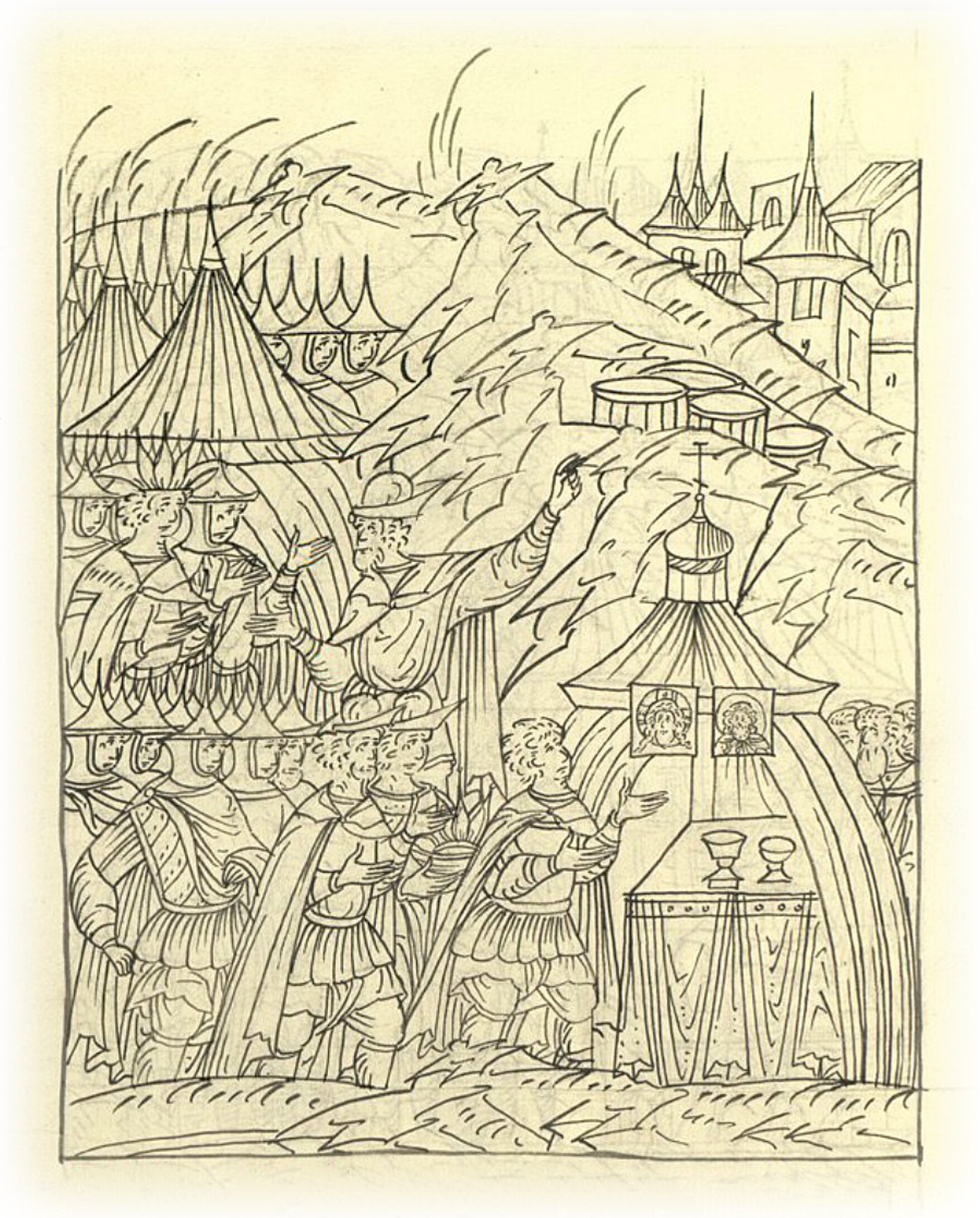 (О подкопе). И государь, услышав Божью милость к себе, царю православному, и всему православию, и победу над нечестивыми, пошел в церковь чудотворца Сергия с благодарными слезами и хвалу воздал об этом милосердному Богу, и впредь милости и помощи просил.