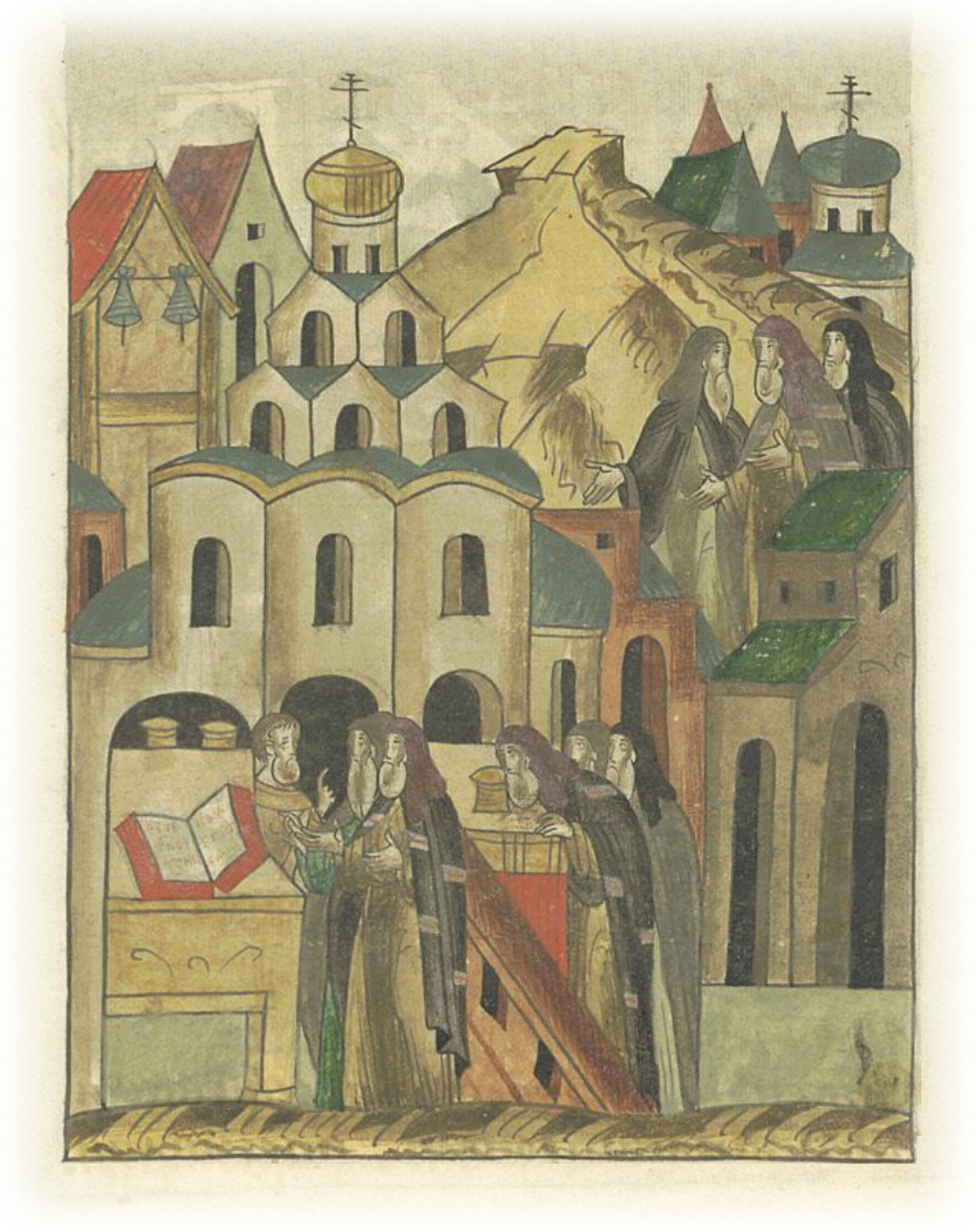 О походе митрополита Пимена в Царьград со Смоленским владыкой Михаилом и Спасским архимандритом Сергием. Чернецы митрополита Пимена и Смоленский епископ Михаил кланяются святыням Царьграда.