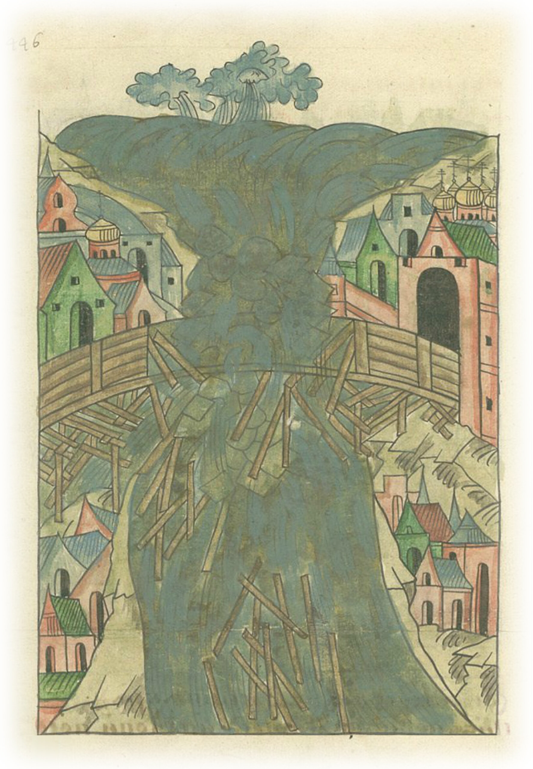 Той же осенью были морозы великие, и реки, и озера замерзли, и снег выпал; также в полночь, месяца октября в 26-й день, в Новгороде Великом поднялся ветер великий, и понес лед из озера в реку Волхов, и вынес из Великого моста 9 устоев.