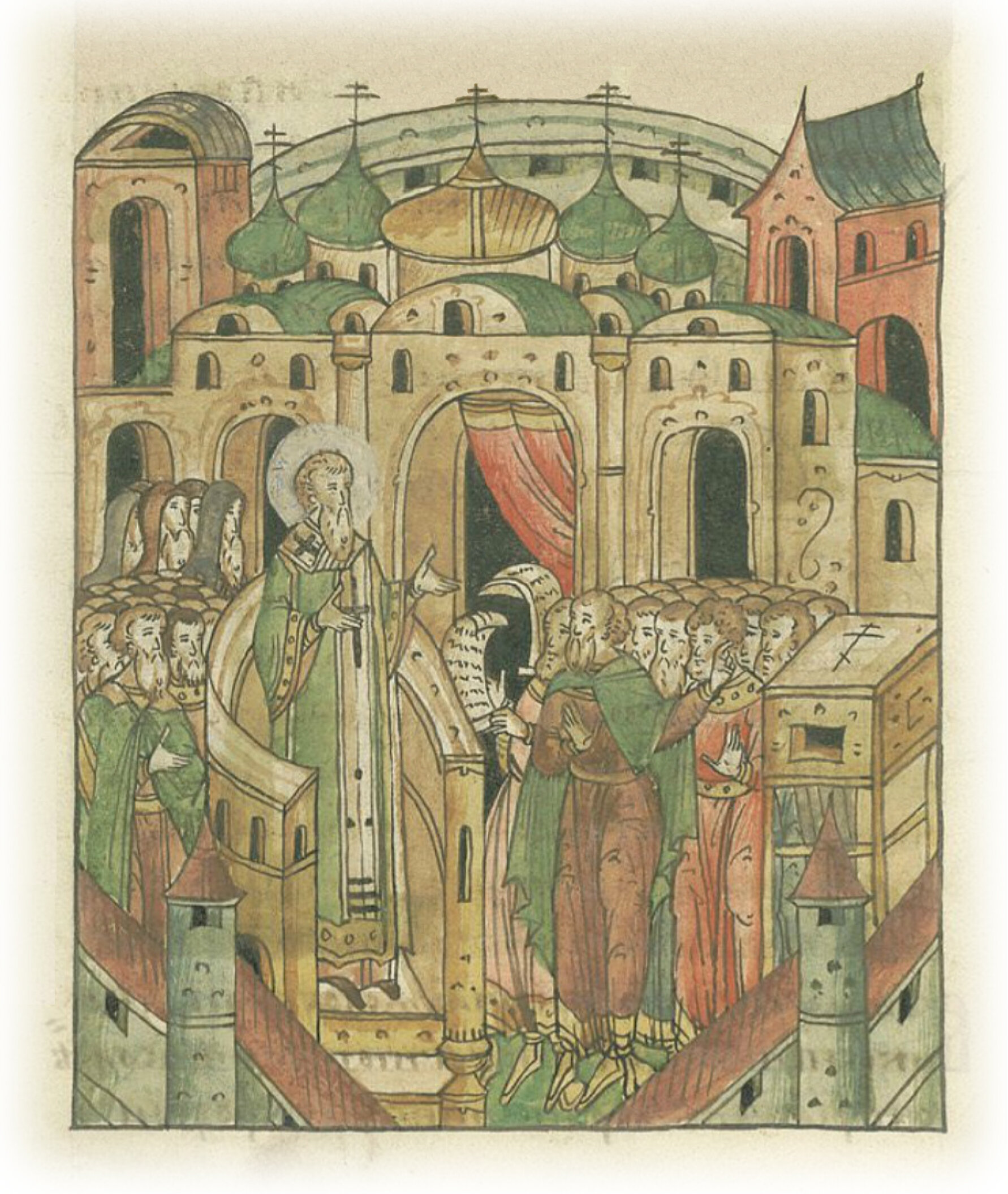 Митрополит просил у них, чтобы он в течение месяца устроил свой митрополичий суд. И новгородцы ответили все единогласно: «Мы все целовали крест на том, чтобы нас не призывали на митрополичий суд, и митрополит бы нас не судил. И об этом грамоты подписали, печати приложили и запечатали». И сказал им Киприан, митрополит всея Руси: «Это сатана своими кознями надоумил вас отнять власть, суд и священные и божественные пошлины, положенные Богу изначально. Как только вы не стыдитесь говорить это мне? Покайтесь в грехе этом и помилосердствуйте в беззаконии вашем, потому что совратил вас сатана. Обратитесь к Богу с покаянием от всего вашего сердца, и простит вас Господь Бог от греха сего, и подаст вам милость. И я с вас сниму целование ваше, и печати ваши порву, и грамоты раздеру, и благословлю, и прощу вас благодатью, данною мне от Бога Отца и Единородного Сына его Господа нашего Исуса Христа, и пресвятого и животворящего Духа. А вы мне суд и пошлины дайте, как было изначально при других митрополитах – отдавать положенное Богу. Что изначально было положено отдавать Богу в великую соборную апостольскую митрополичью церковь, и нами было исполняемо, и это неотъемлемо, и пусть будет неизменно из рода в род». Они же не послушали митрополита и не вняли его словам и его учению. А послания патриарха Антония и его учения ни во что не ставили. Но говорили, вознесясь гордыней, совращенные демонскими поучениями. Киприан митрополит сказал им: «Я и сам грешен, но о вас буду молиться Господу Богу, пречистой Богородице и всем святым. Я и наставлял, и поучал вас, и советы давал вам богоугодные, которые могли спасти вас. Вы же ожесточили сердца ваши и противитесь Духу Святому, и учениями апостольскими и отеческими пренебрегаете. И, положенное Богу, митрополичьи суды, владения и пошлины захватили в свою пользу; и ругаетесь богохульными словами, противными Духу Святому и православной вере христианской. Я сделал все, что мог для спасения вашего, и единственное тягчайшее наказание, которое осталось – отлучение».