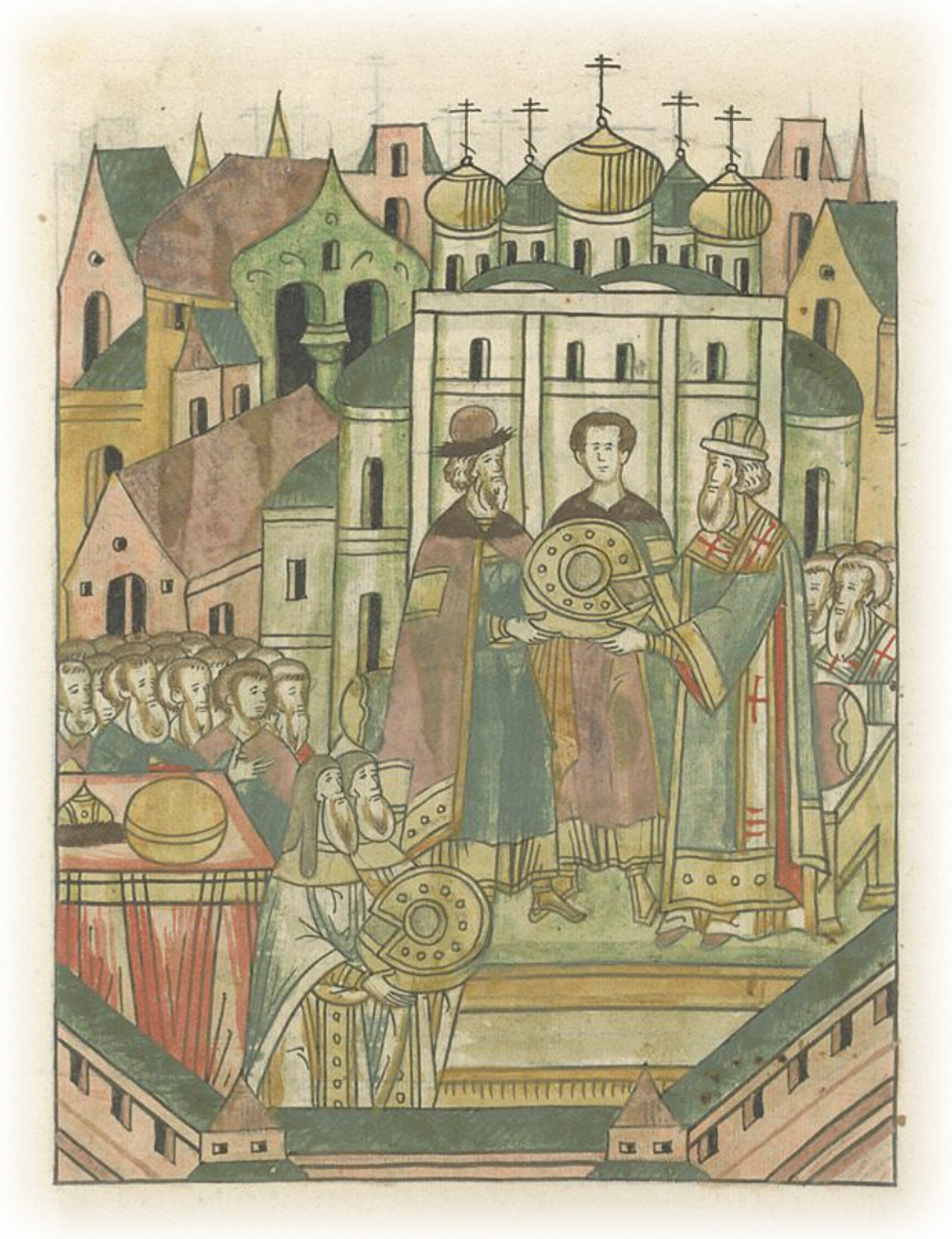 и после молитвы велел митрополит двум архимандритам принести к себе с аналоя бармы, и, взяв их, передал великому князю