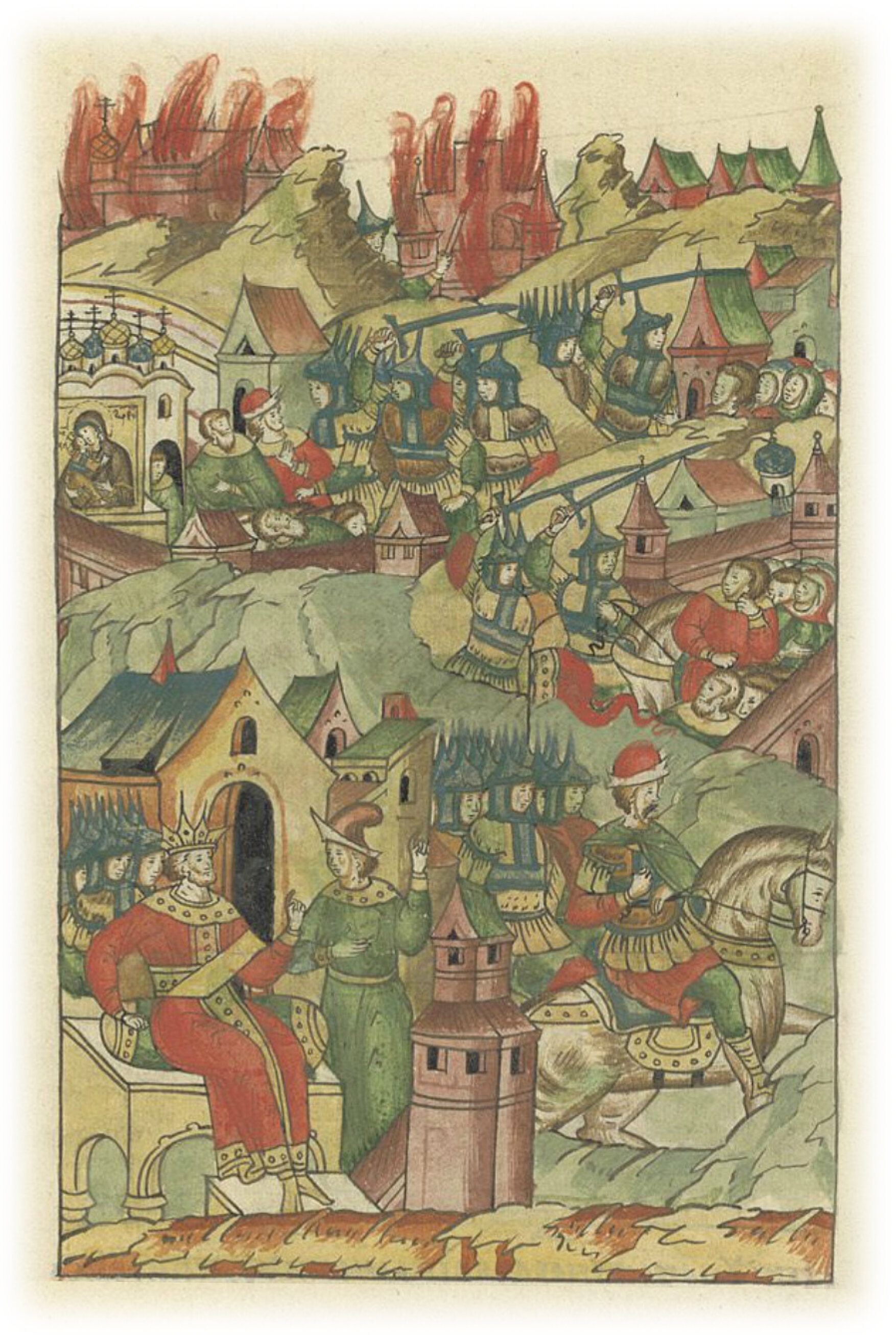 В предыдущем году он впереди себя послал безбожных татар своих, которые взяли города русские: Переяславль, Чернигов, и Мордву, и Муром, и Гороховец, город святой Богородицы соборной церкви Владимирской.