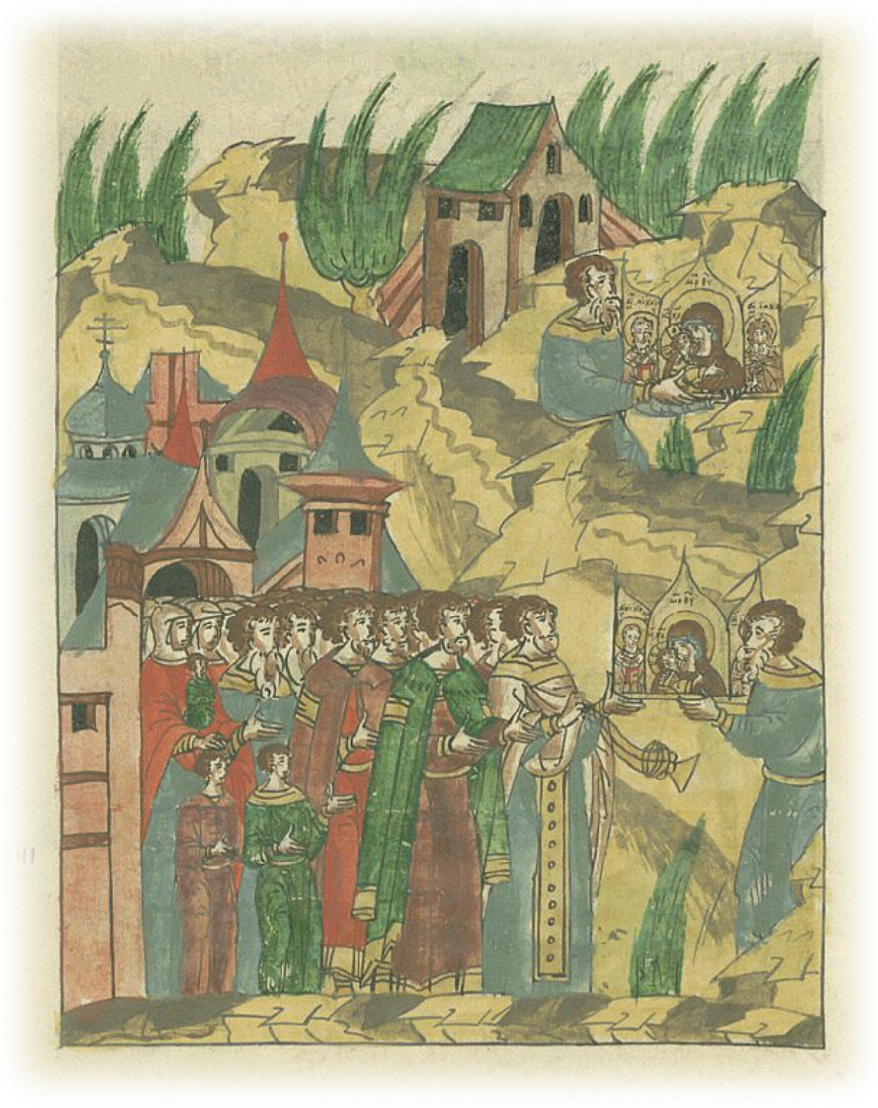 Знамение в вотчине князя Андрея Дмитриевича в Колоче. Исцеление от святой иконы Божьей Матери. Лука, нашедший икону, приносит ее в Можайск, где ее встречает князь Андрей Дмитриевич.