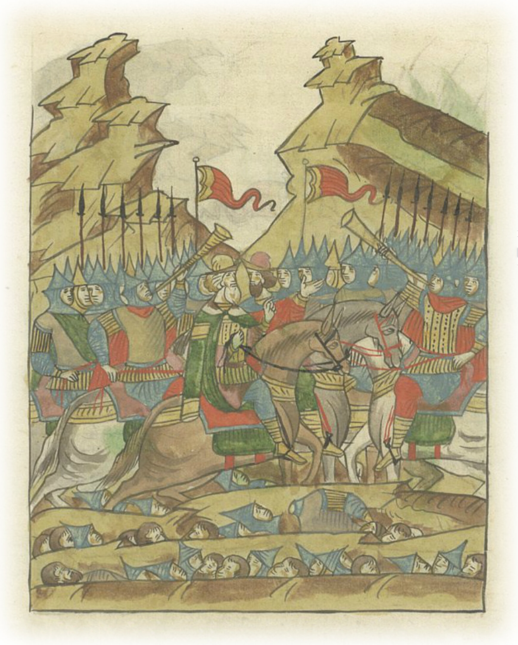 Воеводы же великого князя, князь Данило Холмский да Феодор Давыдович, стоявшие насмерть, вострубили, дождались все свое воинство, и, увидев воинов своих всех в здравии, благодарили Бога и пречистую матерь Его и всех святых.