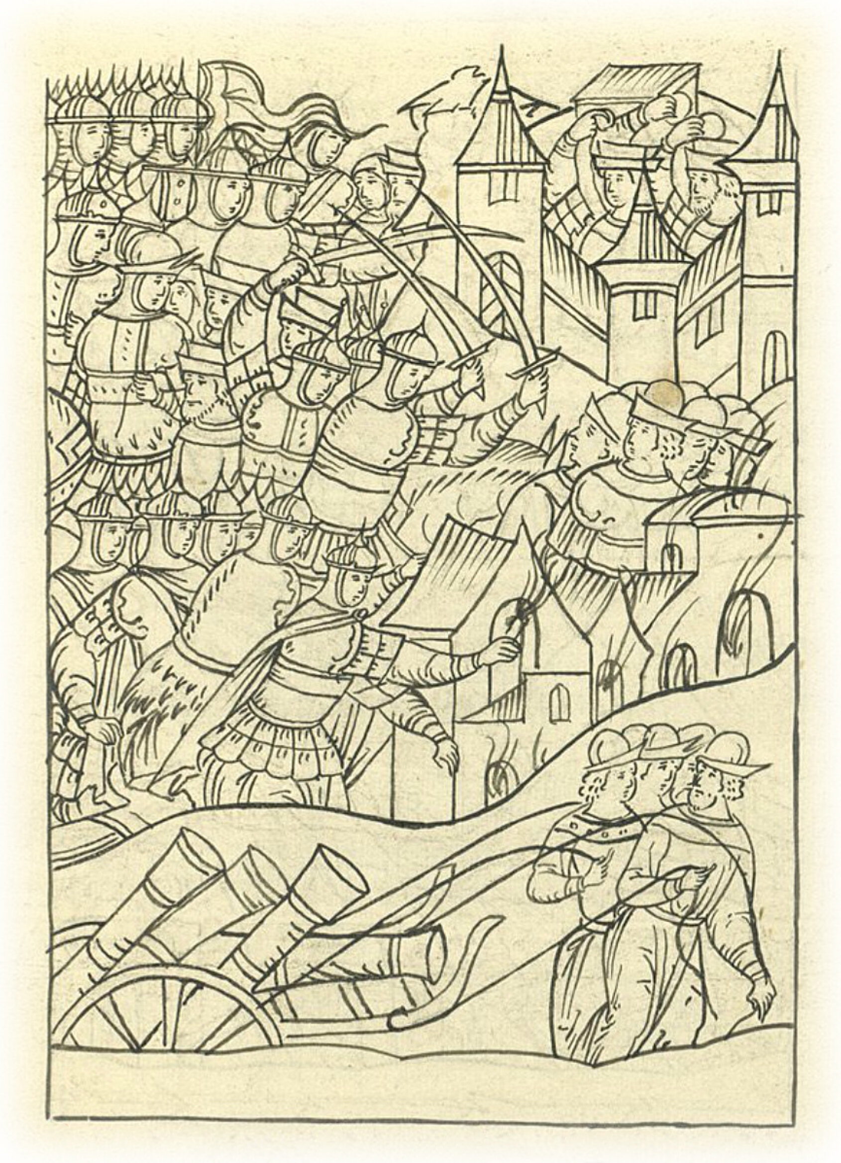 А воеводы великого князя, князь Василий Васильевич Шуйский с товарищами, пришли к Мстиславлю с нарядом, с пушками и пищалями, да на посад напали и на посаде многих людей поймали в полон, а иных посекли, а посад сожгли; а город Мстиславль отстояли.