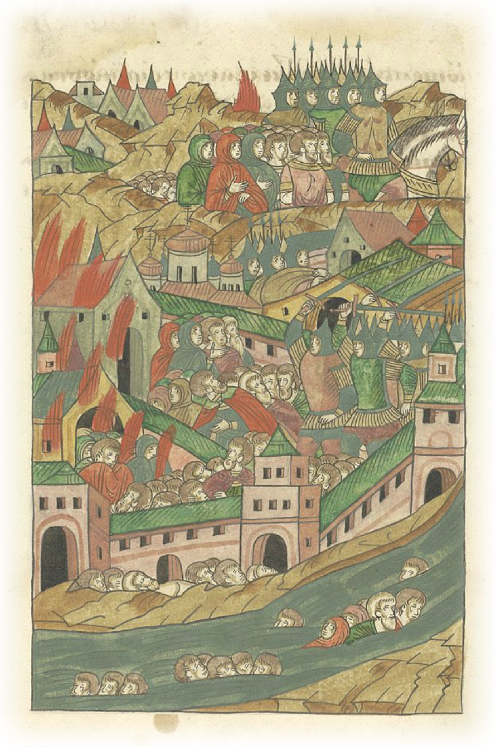 Так быстро злые (татары) взяли город Москву месяца августа в 26-й день, на память святого мученика Андреяна и Наталии, в 7-й час дня, в четверг, после обеда. И город огнем запалили, а товары и богатство все разграбили, а людей мечу предали. И был оттуда – огонь, а отсюда – меч: одни – от огня убегая, от меча померли, а другие – от меча убегая, в огне сгорели. И была им четверообразная пагуба: первое – от меча, второе – от огня, третье – от воды, а четвертое – в полон поведены были.