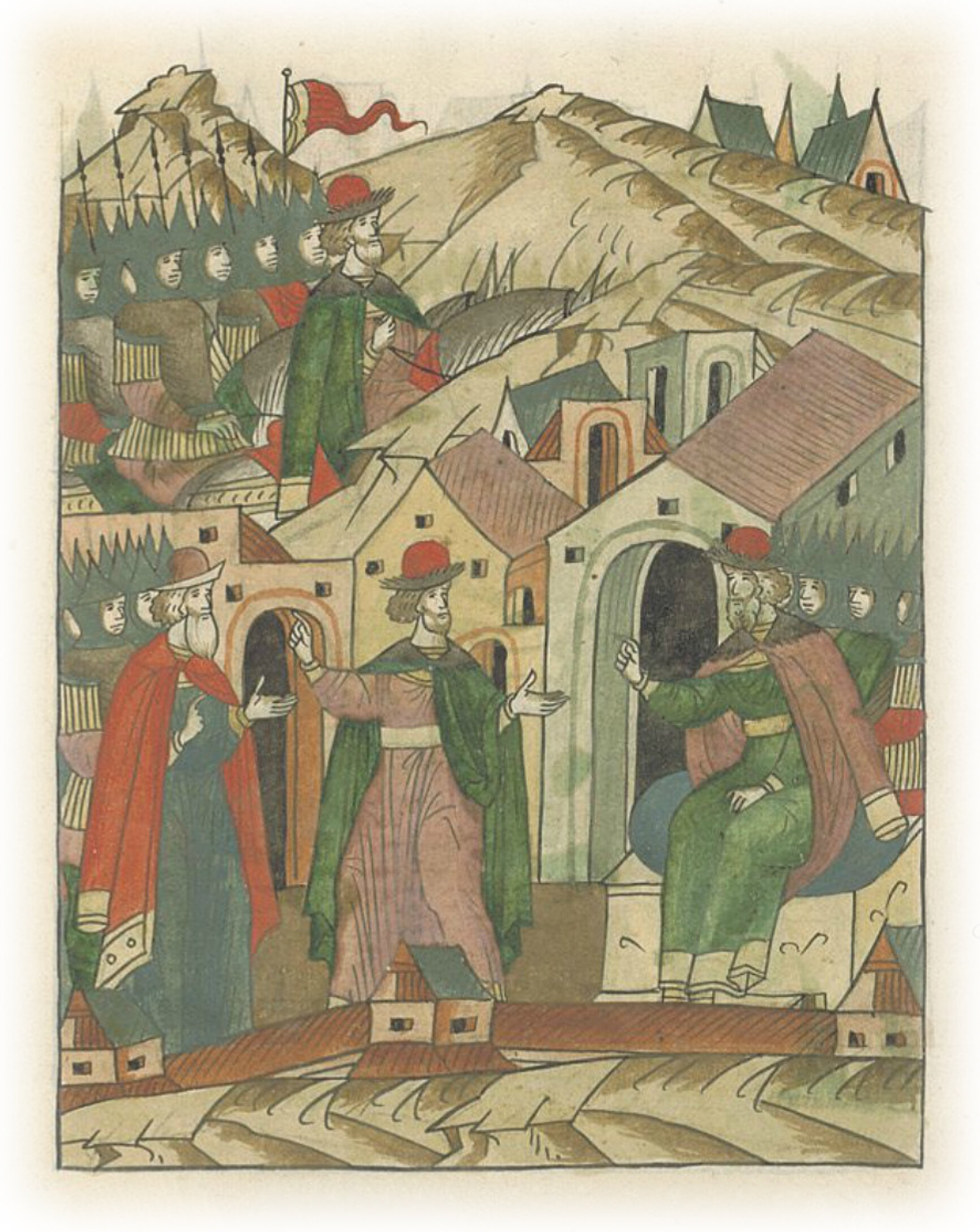 Ругодивские посадники Яким и Захар приезжают в Москву. Воеводы царя Ивана Васильевича Алексей Адашев и Иван Михайлов сообщают им, что государь пожалует их, если сдадут его воеводам помимо Ругодива Вышгород.