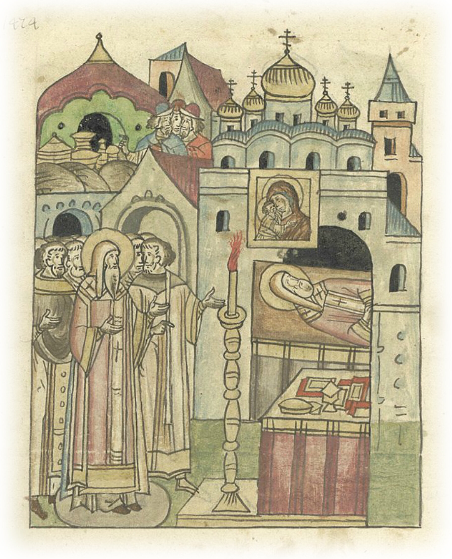 Он, приготовив все необходимое для путешествия, отслужил молебен в соборной церкви Пречистой Богородицы, во время которого сама собой загорелась свеча у гроба святого чудотворца Петра.