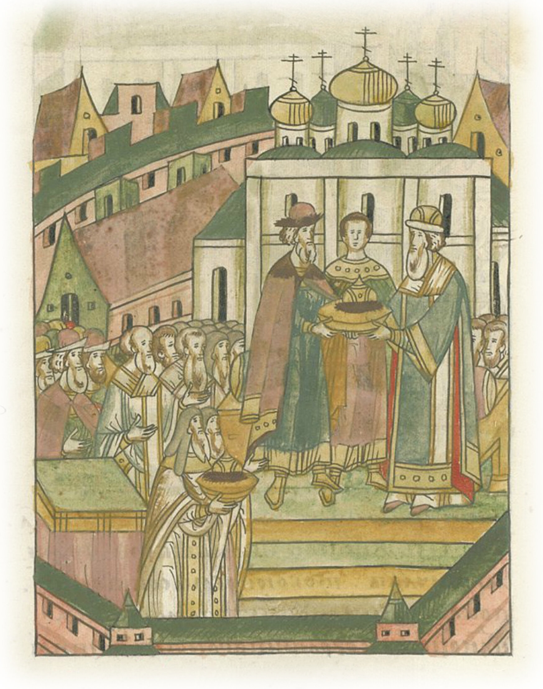 И после «Аминь» велел митрополит двум архимандритам принести к себе шапку с аналоя, и, взяв ее, подал великому князю.