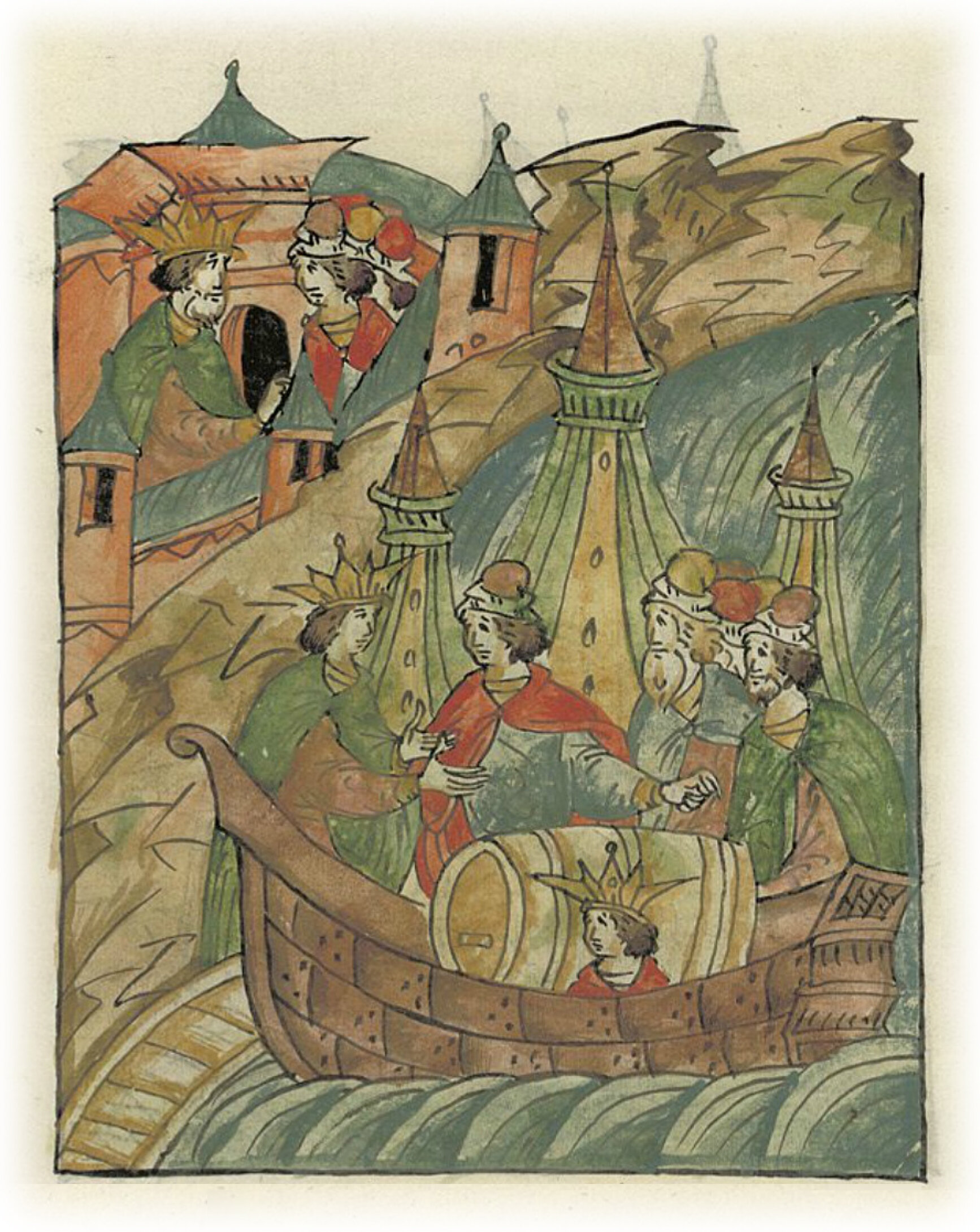 Сына Исаака сажают в бочку на корабле, так как другим путем нельзя было покинуть город, и он уезжает из Греческой земли.