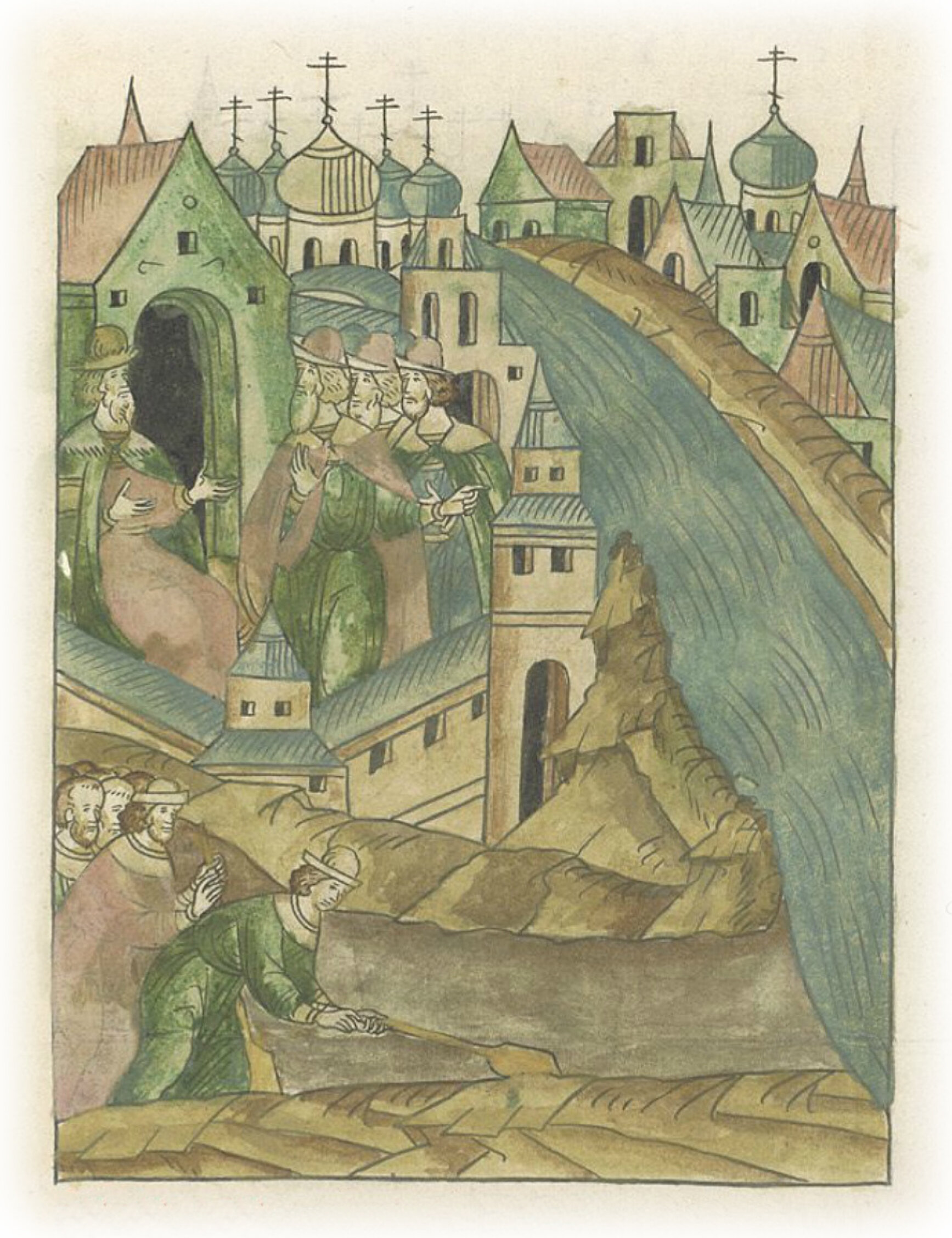 Повелением великого князя Ивана Васильевича копают ров от Боровицкой стрельницы до реки Москвы.