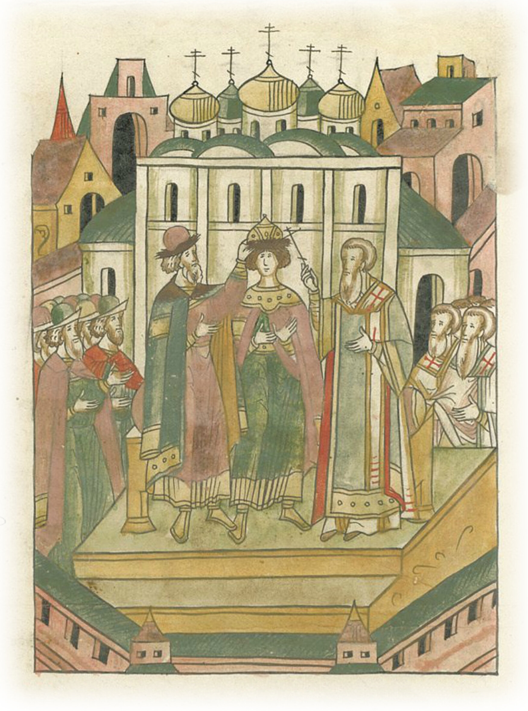 Возведение на престол внука великого князя Ивана Васильевича, князя Дмитрия Ивановича, в церкви Пречистой Богородицы в Москве.