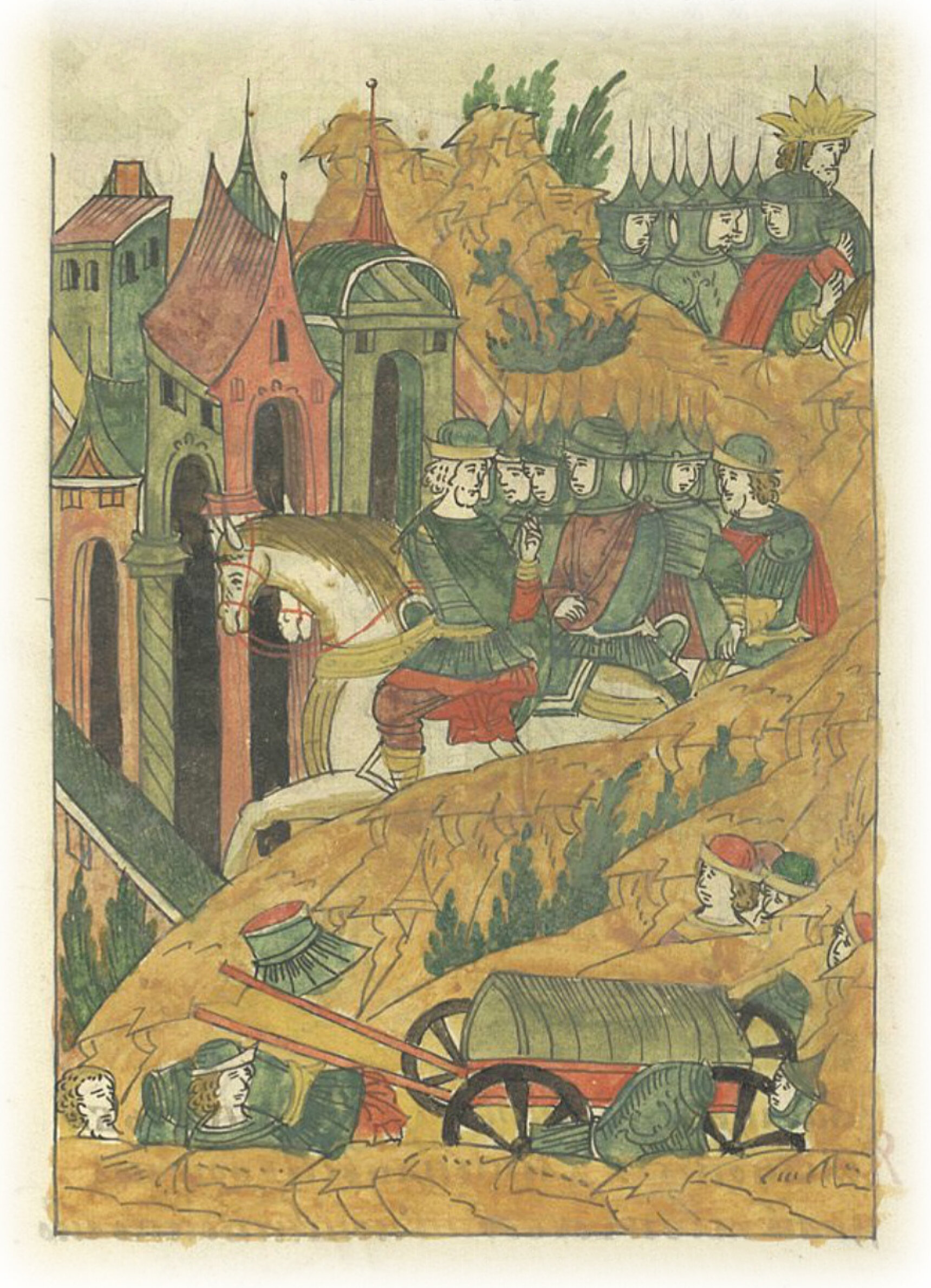 Языки говорят воеводам царя Ивана Васильевича, что магистр окопался большим рвом вокруг города Рындола, бьет из пушек и пищалей и приступает к Рындолу.