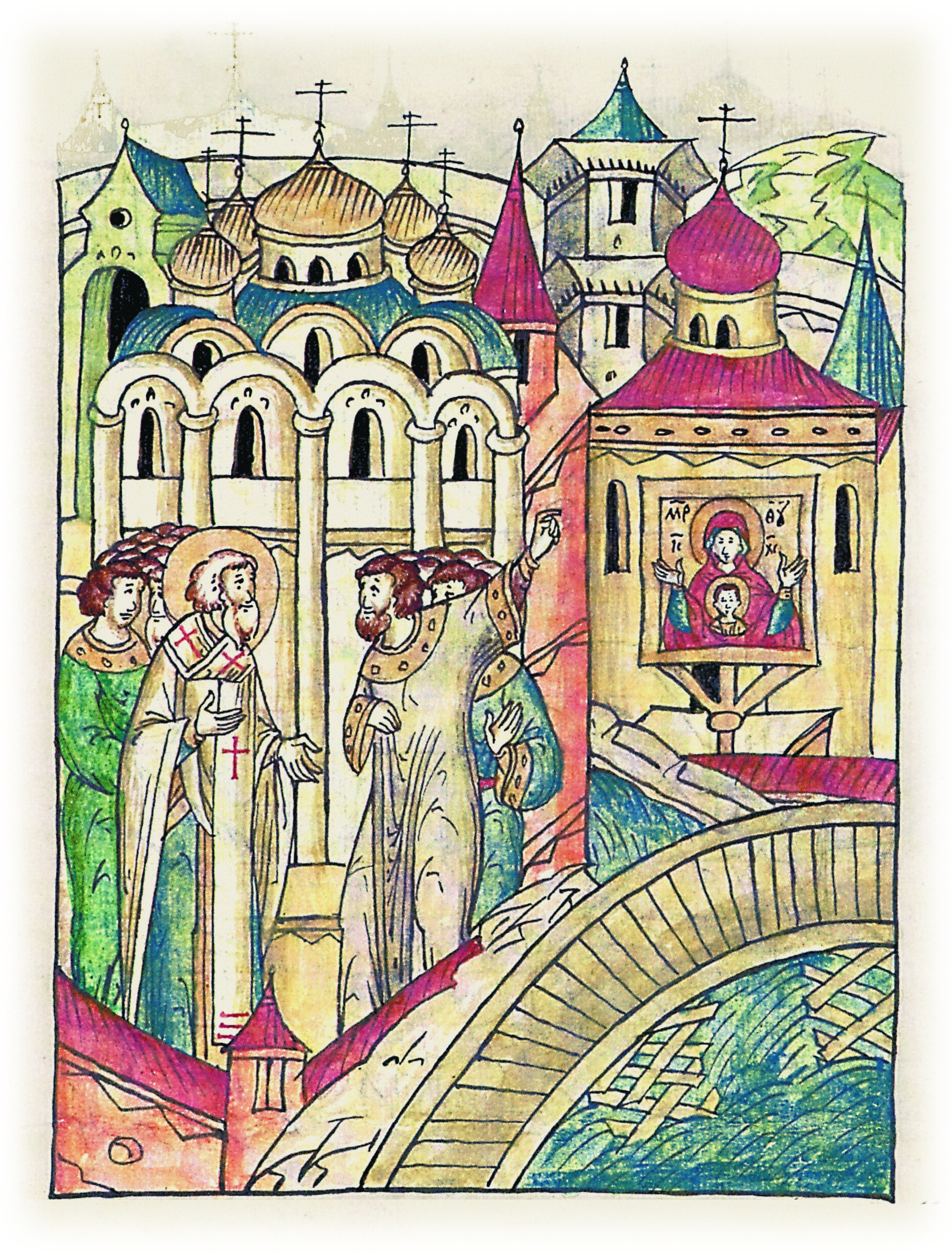 Архидьякон рассказывает новгородскому архиепископу Ивану о том, что он пытался взять икону Богоматери, но она не сдвинулась с места.