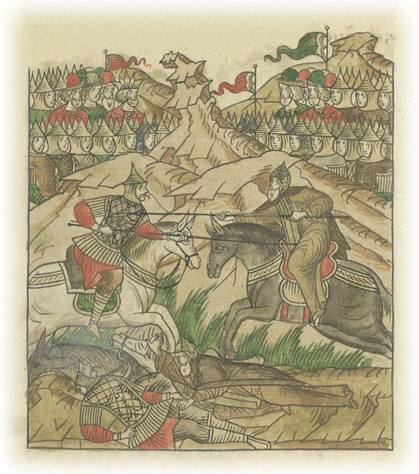 И так инок Пересвет, послушник преподобного игумена Сергия, пошел против татарского богатыря Темир-Мурзы, и ударились крепко, столь громко и сильно, что земля потряслась, и пали оба на землю мертвыми, и тут конец приняли оба; также и кони их в тот же час мертвыми пали.